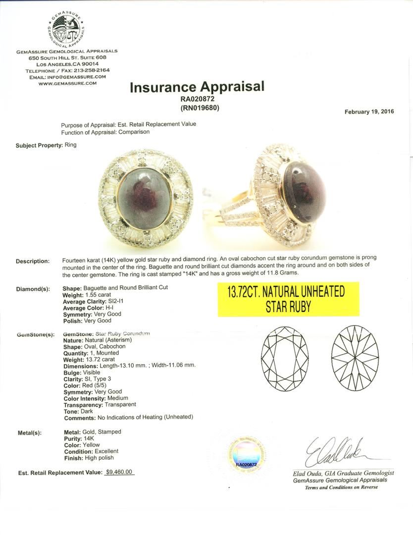 #Description:# Fourteen karat (14K) yellow gold star ruby and diamond ring. An oval cabochon cut star ruby corundum gemstone is prong mounted in the center of the ring. Baguette and round brilliant cut diamondS accent the ring around and on both sides of the center gemstone. The ring is cast stamped - 14K and has a gross weight of 11.8 Grams. #Diamond(s):# Shape: Baguette and Round Brilliant Cut Weight: 1.55 carat Average Clarity: SI2-I1 Average Color: H-I Symmetry: Very Good Polish: Very Good #Gemstone(S):# Gemstone: Star, Ruby Corundum Nature: Natural (Asterism) Shape: Oval, Cabochon Quantity: 1, Mounted Weight: 13.72 carat Dimensions: Length-13.10mm. Width-11.06mm. Bulge: Visible Clarity: SI, Type 3 Color: Red (5/5) Symmetry: Very Good Color Intensity: Medium Transparency: Transparent Tone: Dark Comments: No Indications of Heating (Unheated) #Metal(s):# Metal: Gold, Stamped Purity: 14K Color: Yellow Condition: Excellent Finish: High polish