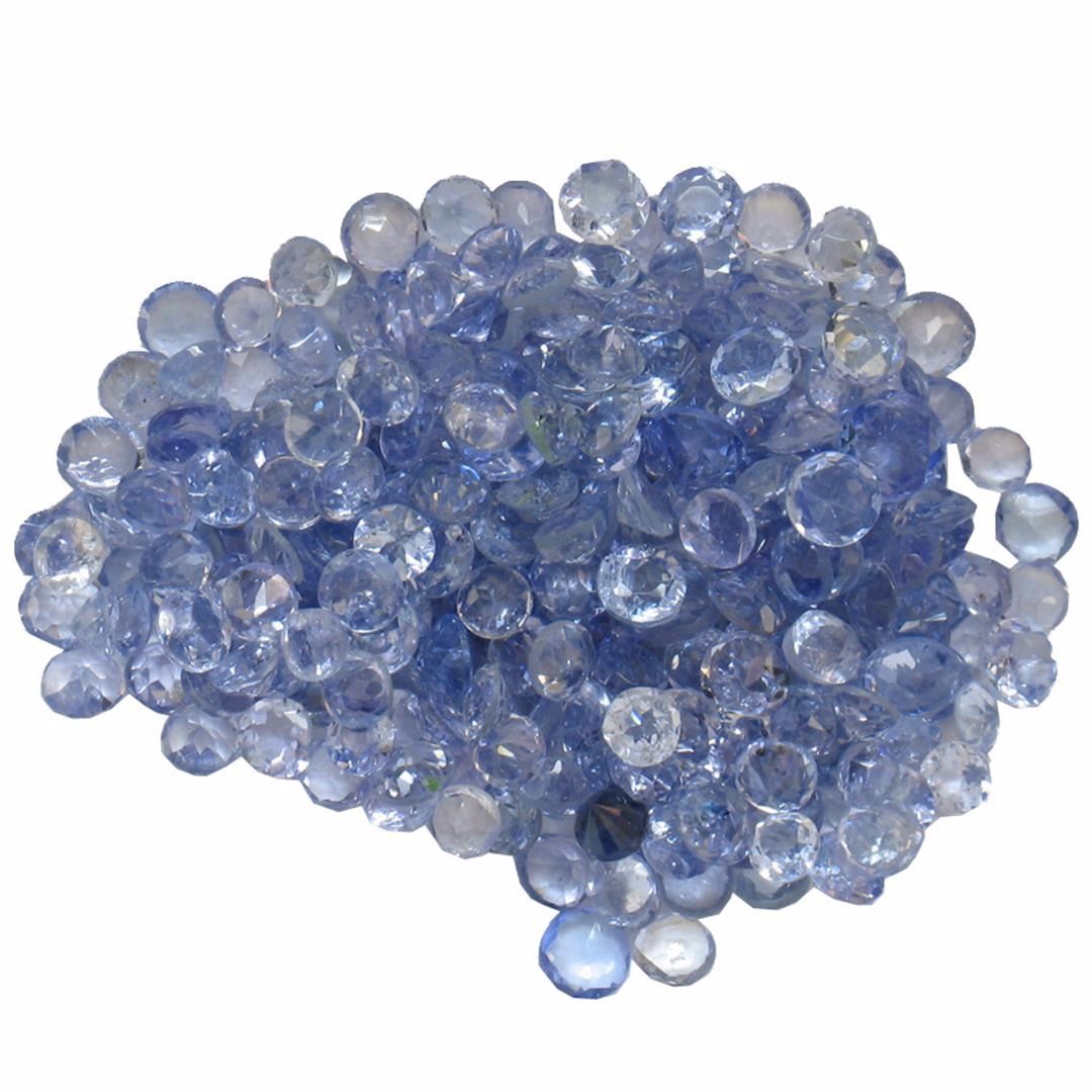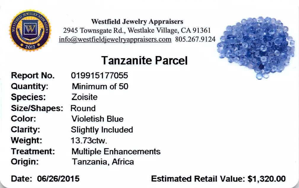 Fifty round mixed cut natural tanzanites, measuring 2.00 - 2.00 x 1.30 mm, exact total weight 13.73ct., clarity is slightly included, type I, medium, very slightly grayish, violetish blue color, (GIA vB 5/3), cut is good. Measurements & the color grade are an average for the group, Color grade is an average for the group, Transmitting light with no distortion, transparent, Naturally occurring internal & external characteristics are present, Indications of multiple laboratory enhancements, including high temperature heat treatment. Westfield Appraised at $1,320.00.