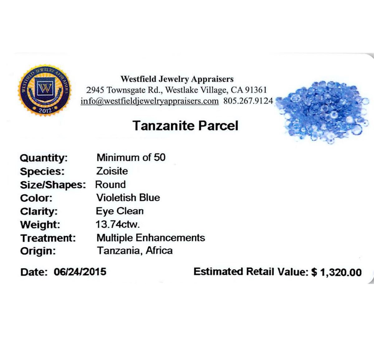 Fifty round mixed cut natural tanzanites, measuring 4.00 - 3.00 x 2.33 mm, exact total weight 13.74ct., clarity is slightly included, type I, medium dark, very slightly grayish, violetish blue color, (GIA vB 6/3), cut is good. Measurements & the color grade are an average for the group, Color grade is an average for the group, Transmitting light with no distortion, transparent, Naturally occurring internal & external characteristics are present, Indications of multiple laboratory enhancements, including high temperature heat treatment. Westfield Appraised at $1,320.00.
