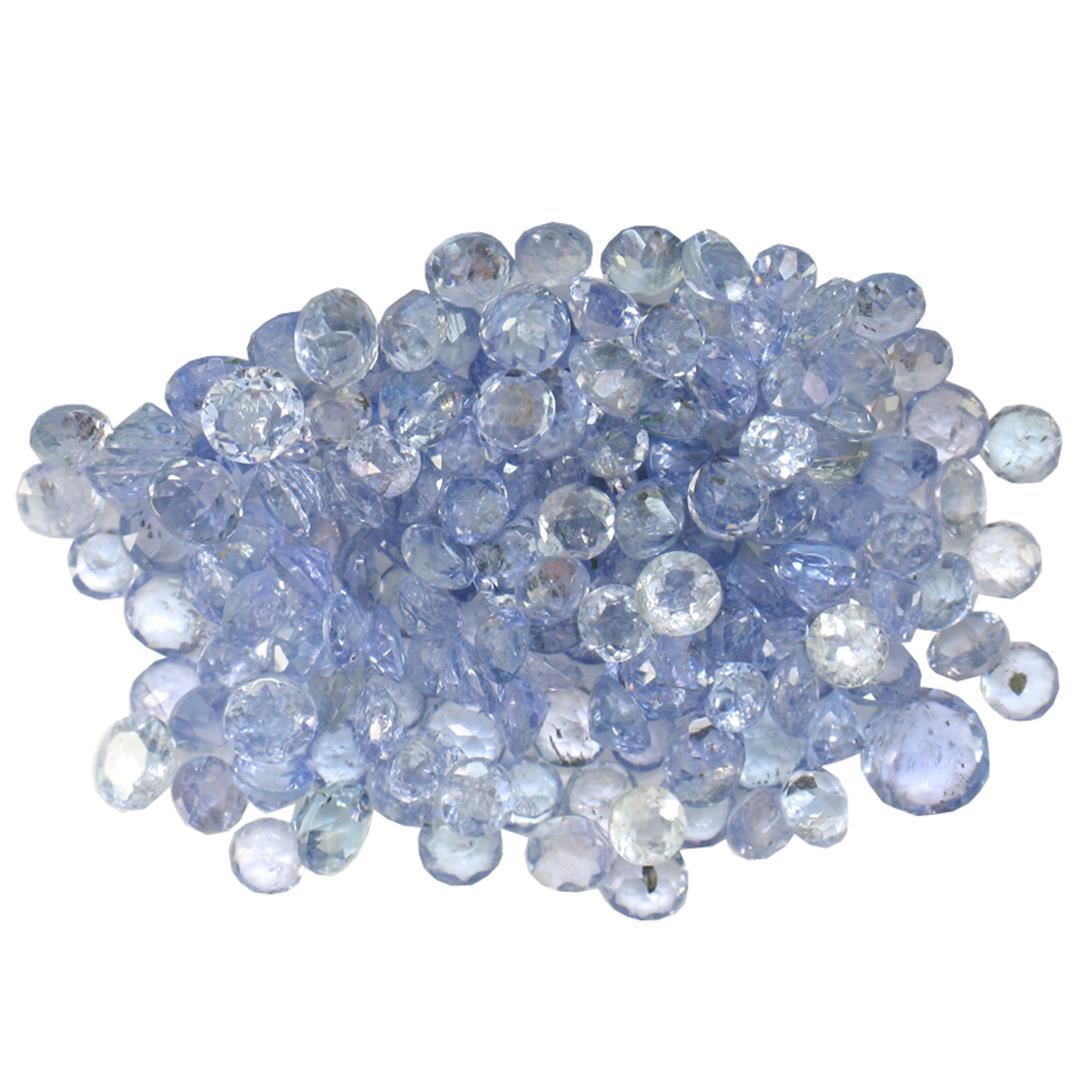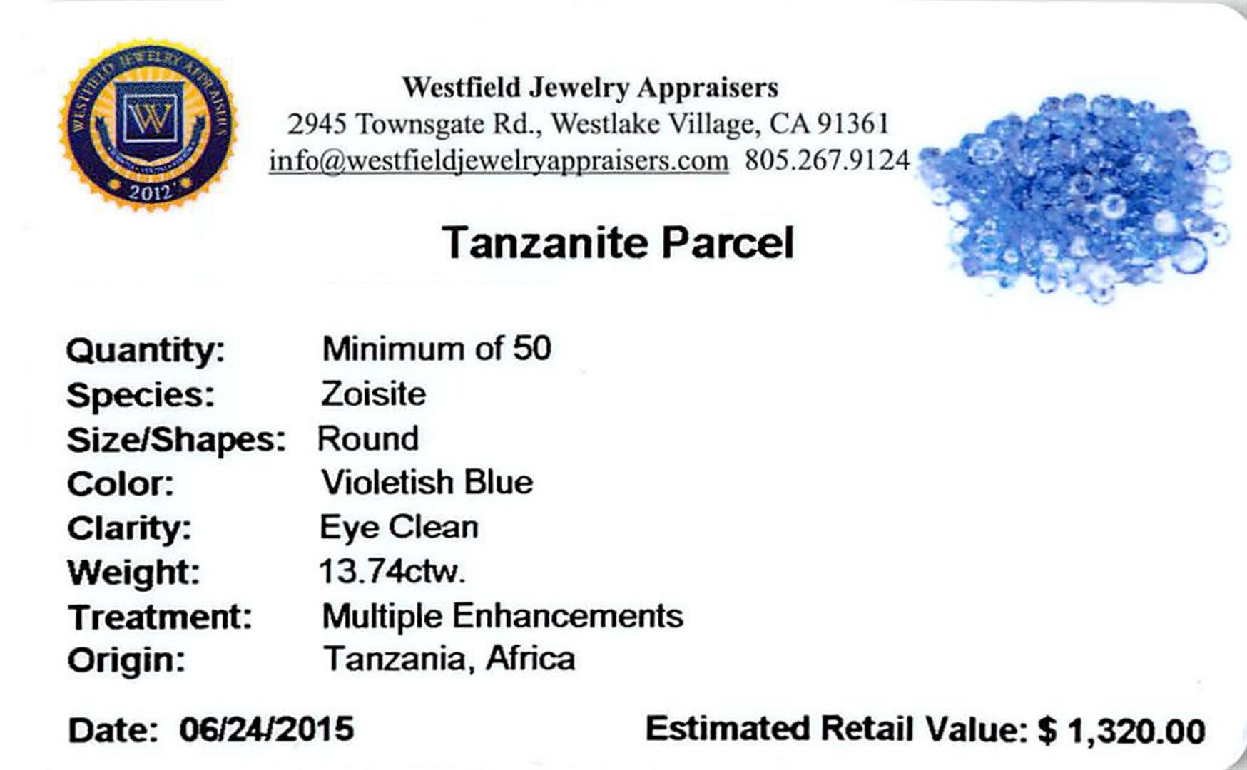 Fifty round mixed cut natural tanzanites, measuring 4.00 - 3.00 x 2.33 mm, exact total weight 13.74ct., clarity is slightly included, type I, medium dark, very slightly grayish, violetish blue color, (GIA vB 6/3), cut is good. Measurements & the color grade are an average for the group, Color grade is an average for the group, Transmitting light with no distortion, transparent, Naturally occurring internal & external characteristics are present, Indications of multiple laboratory enhancements, including high temperature heat treatment. Westfield Appraised at $1,320.00.