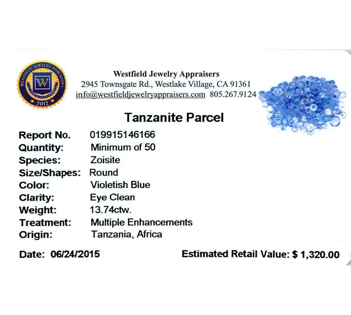 Fifty round mixed cut natural tanzanites, measuring 4.00 - 3.00 x 2.33 mm, exact total weight 13.74ct., clarity is slightly included, type I, medium dark, very slightly grayish, violetish blue color, (GIA vB 6/3), cut is good. Measurements & the color grade are an average for the group, Color grade is an average for the group, Transmitting light with no distortion, transparent, Naturally occurring internal & external characteristics are present, Indications of multiple laboratory enhancements, including high temperature heat treatment. Westfield Appraised at $1,320.00.
