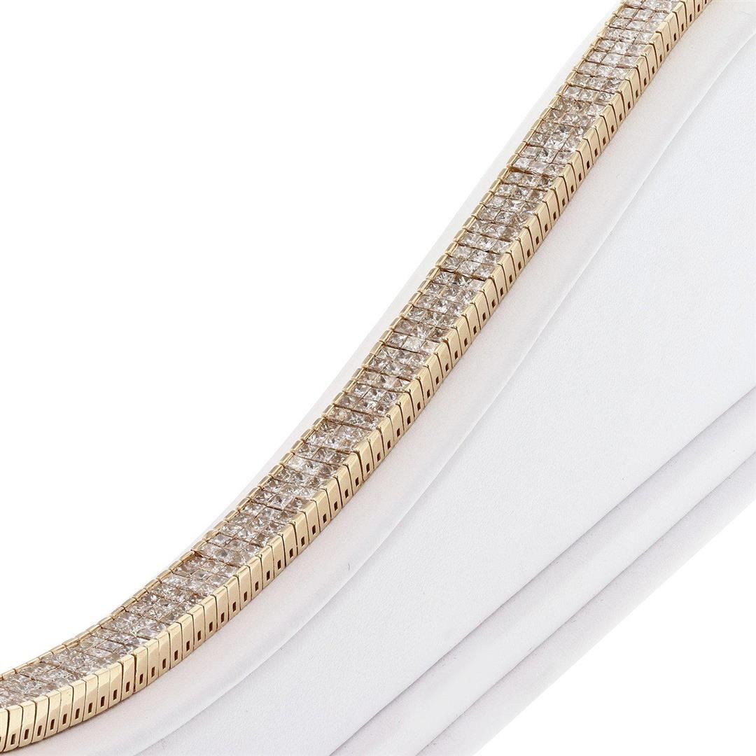 13.76ctw Diamond 14K Yellow Gold Tennis Bracelet. One electronically tested 14KT yellow gold ladies cast and assembled diamond tennis bracelet. Seven and three-quarter inch length bracelet composed of a flexible ribbon of diamonds, terminating in a concealed clasp with twin safeties. Identified with markings of "14K". Condition is new, good workmanship. Bright polish finish. Tennis bracelets and necklaces got their unusual name from an incident involving the U.S. professional tennis player Chris Evert during a tennis match in the 1980's. Evert had been wearing an expensive diamond bracelet, an inline string of individually-set diamonds. Previously these bracelets were known as eternity bracelets. When the clasp snapped during play, she asked the officials to stop the tennis match until the bracelet could be found. Since that day, bracelets and necklaces featuring an inline string of diamonds have been called tennis bracelets and tennis necklaces. Containing: Two hundred fifty-eight invisible set princess cut diamonds, measuring 2.10mm x 1.90mm x 1.43mm (depth est.) approximate total weight of 258 Stones = 13.76ct. Graded in the setting. Clarity SI2 to I2 Color G - I Total Weight of Diamonds 13.76ct. Total Weight of Bracelet 41.22 gm