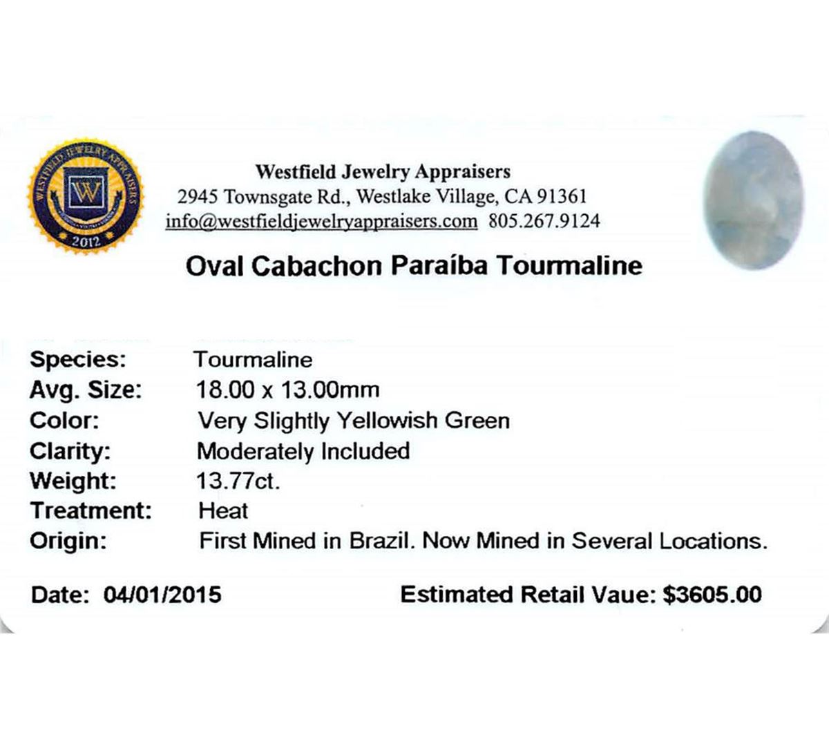 One oval cabochon cut natural Paraiba tourmaline exact weight 13.77ct., clarity is moderately included, cut is good. Westfield Appraised at $3,605.00.