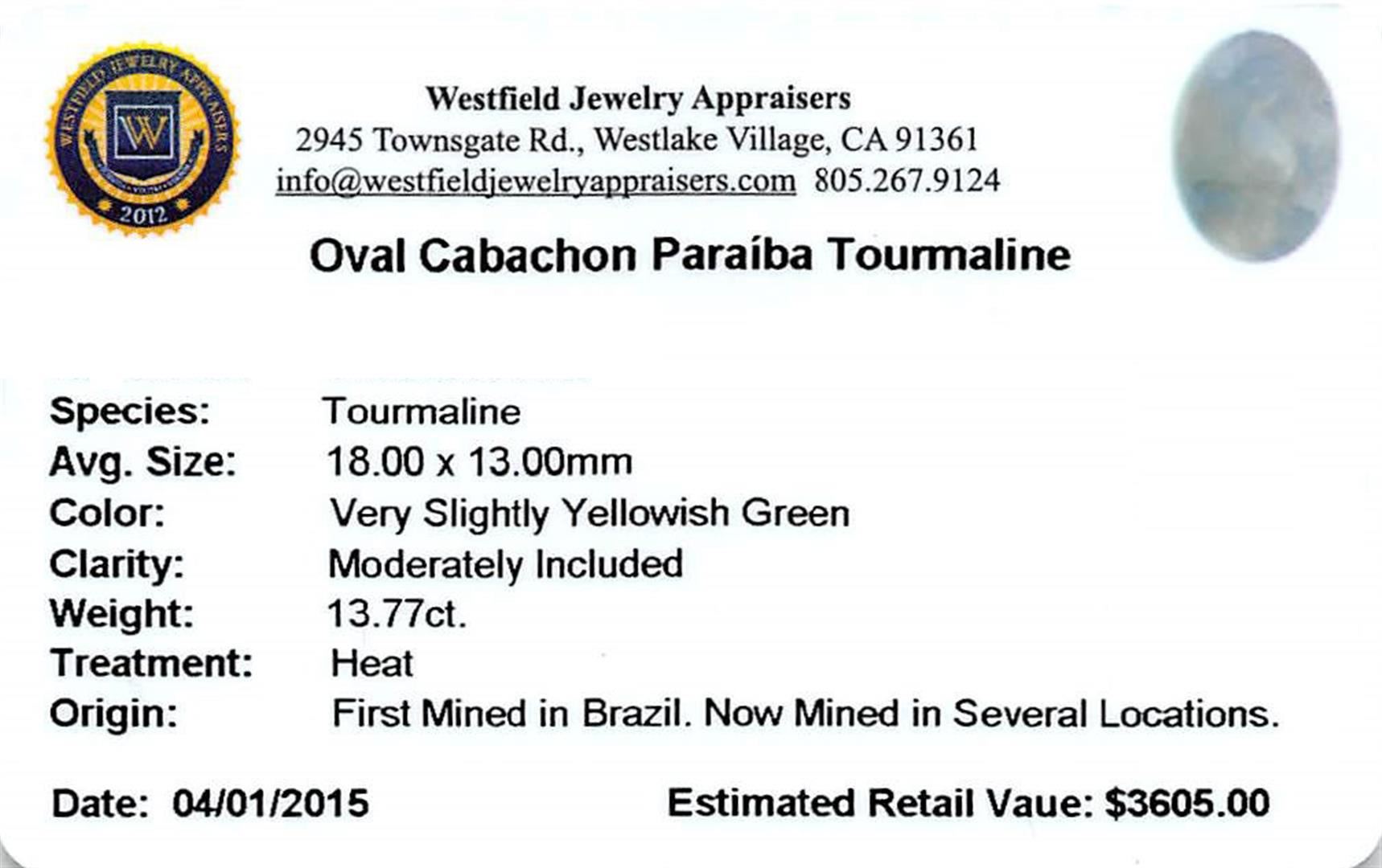 One oval cabochon cut natural Paraiba tourmaline exact weight 13.77ct., clarity is moderately included, cut is good. Westfield Appraised at $3,605.00.