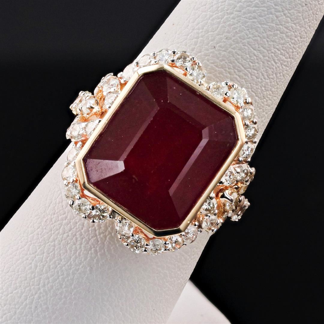 DESCRIPTION: ONE 14K YELLOW GOLD LADY'S CUSTOM MADE DIAMOND and RUBY RING. 8.30 GR TW. #1 - MAIN CENTER GEMSTONE(S):# IDENTITY: ONE CENTER NATURAL "RUBY COMPOSITE" SET IN BEZEL SETTING CARAT WEIGHT: 13.77 CTS SHAPE and MEASUREMEMT: EMERALD CUT QUALITY: DARK RED, GLASS TREATEMENT APPLIED #2 - ADJACENT GEMSTONES:# IDENTITY: NATURAL DIAMONDS SHAPE: ROUND BRILLIANT CUT CARAT WEIGHT: 1.47 CTS QUALITY: H/J COLOR RANGE, SI CLARITY RANGE ALL FINE CUTTING AND PROPORTIONS TOTAL GEMSTONES WEIGHT: 15.24 CTS TW.