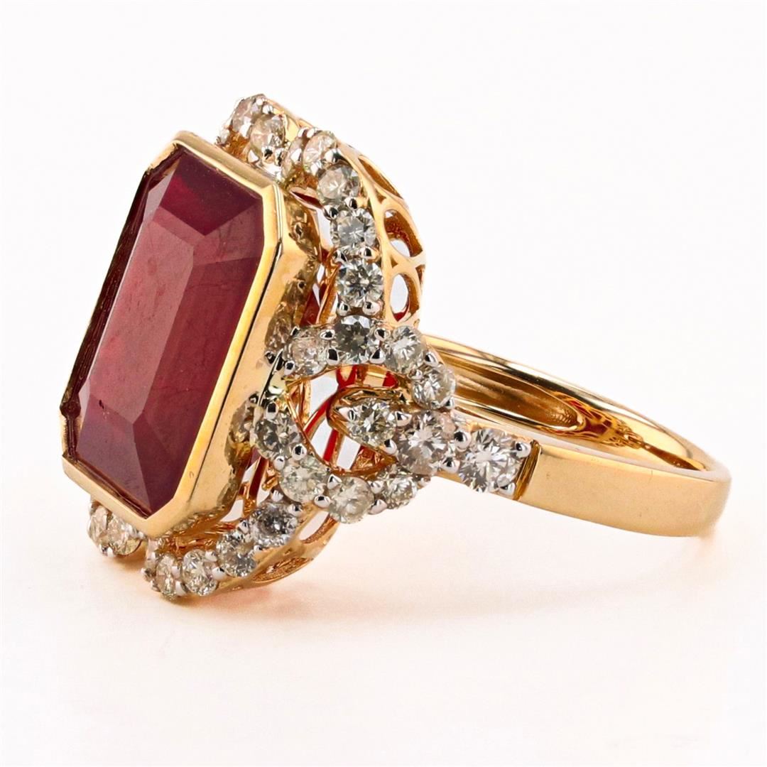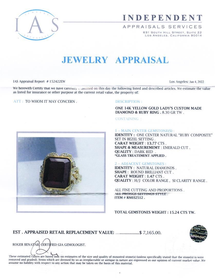 DESCRIPTION: ONE 14K YELLOW GOLD LADY'S CUSTOM MADE DIAMOND and RUBY RING. 8.30 GR TW. #1 - MAIN CENTER GEMSTONE(S):# IDENTITY: ONE CENTER NATURAL "RUBY COMPOSITE" SET IN BEZEL SETTING CARAT WEIGHT: 13.77 CTS SHAPE and MEASUREMEMT: EMERALD CUT QUALITY: DARK RED, GLASS TREATEMENT APPLIED #2 - ADJACENT GEMSTONES:# IDENTITY: NATURAL DIAMONDS SHAPE: ROUND BRILLIANT CUT CARAT WEIGHT: 1.47 CTS QUALITY: H/J COLOR RANGE, SI CLARITY RANGE ALL FINE CUTTING AND PROPORTIONS TOTAL GEMSTONES WEIGHT: 15.24 CTS TW.