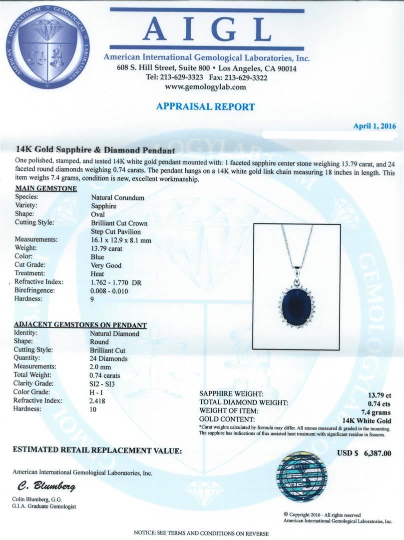 14K Gold Sapphire & Diamond Pendant. One polished, stamped, and tested 14K white gold pendant mounted with: 1 faceted sapphire center stone weighing 13.79 carat, and 24 faceted round diamonds weighing 0.74 carats. The pendant hangs on a 14K white gold link chain measuring 18 inches in length. This item weighs 7.4 grams, condition is new, excellent workmanship. Main gemstone: Species: Natural Corundum. Variety: Sapphire. Shape: Oval. Cutting style: Brilliant cut crown step cut pavilion. Measurements: 16.1 x 12.9 x 8.1 mm. Weight: 13.79 carat. Color: Blue. Cut grade: Very good. Treatment: heat. Refractive index: 1.762-1.770 DR. Birefringence: 0.008-0.010. Hardness: 9. Adjacent gemstones on pendant: Identity: Natural diamond. Shape: Round. Cutting style: Brilliant cut. Quantity: 24 diamonds. Measurements: 2.0 mm. Total weight: 0.74 carats. Clarity grade: SI2-SI3. Color grade: H-I. Refractive index: 2.418. Hardness: 10. AIGL Appraised at $6,387.00.