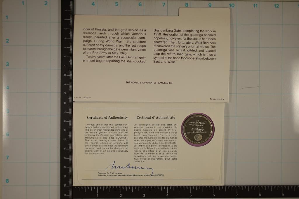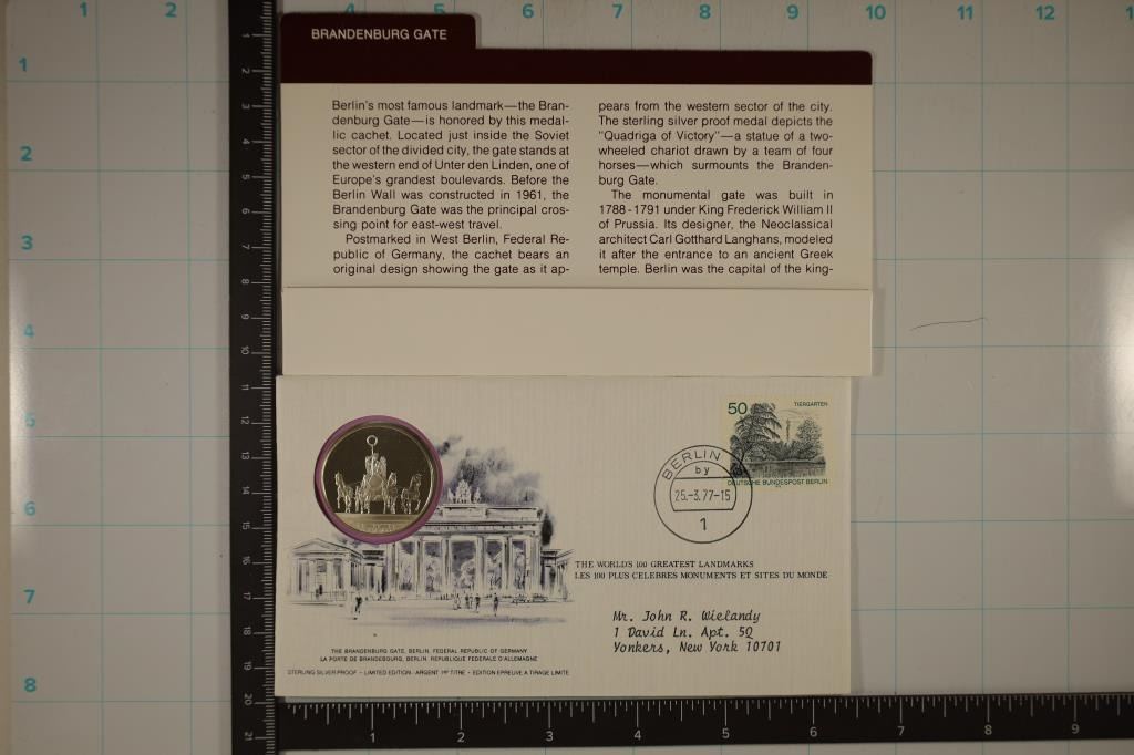 "BRANDENBERG GATE, BERLIN GERMANY FDC, WORLDS 100 GREATEST LANDMARKS WITH INFO CARD BY THE FRANKLIN MINT "