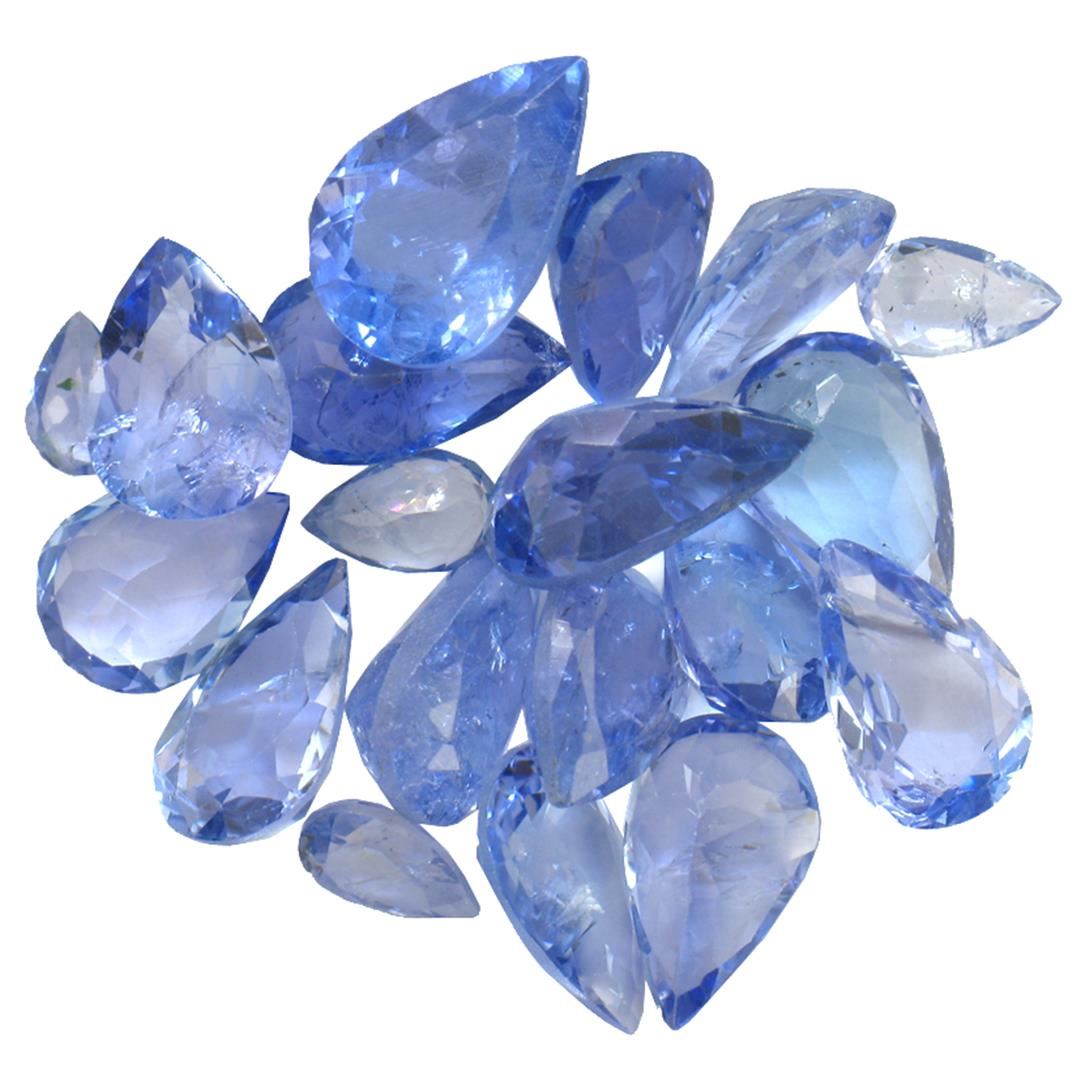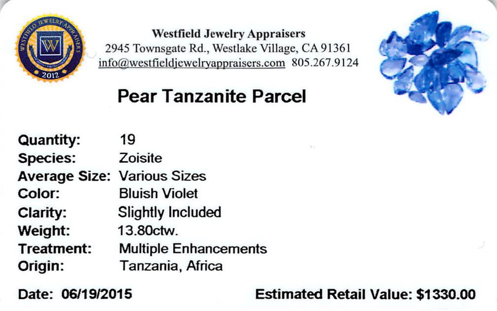 Nineteen pear mixed cut natural tanzanites exact total weight 13.80ct., clarity is slightly included, type I, medium dark, very slightly grayish, bluish violet color, (GIA bV 6/3), cut is good. Transmitting light with a minimum of distortion, transparent. Naturally occurring internal & external characteristics are present. Color grade is an average for the group. Tanzanite is a very rare gemstone that is only found in the country of Tanzania. Originally discovered in 1967. Tiffany & Company, named the stone Tanzanite. It is found in the Usumburu Mountains that border the Umba Valley of northern Tanzania. Tanzanite occurs in gray, brown, violet, blue, reddish-purple, & green. The gem is interesting because of its exceptional pleochroism. Rotated in different directions a tanzanite will exhibit multiple changes of color. Tanzanite has a low tolerance to ultrasonic cleaning, and should not be cleaned using this method. Westfield Appraised at $1,330.00.