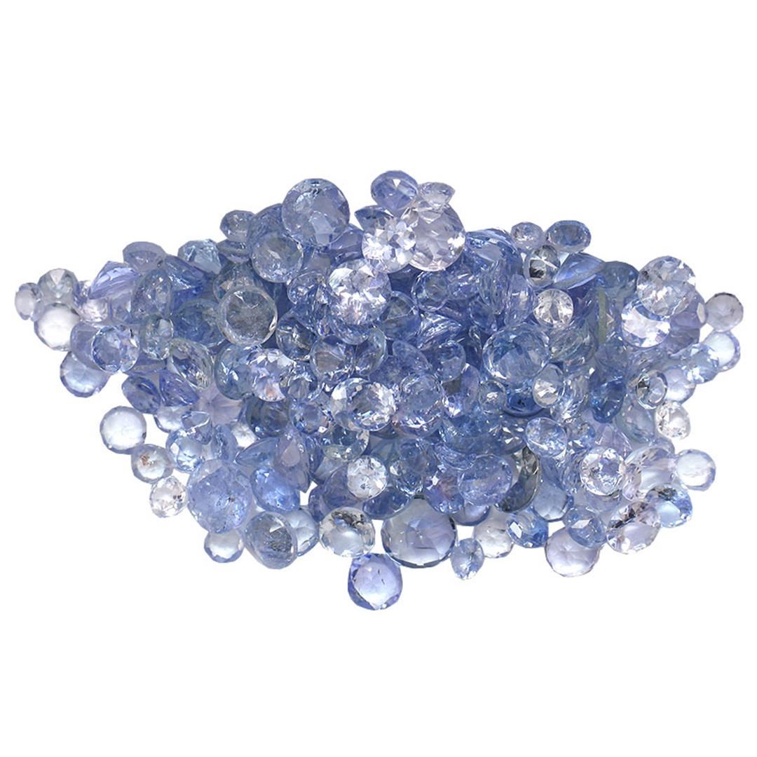 One hundred fifty round mixed cut natural tanzanites exact total weight 13.81ct., clarity is eye clean, type I, medium dark, very slightly grayish, bluish violet color, (GIA bV 6/3), cut is good. Transmitting light with no distortion, transparent. Color grade is an average for the group. Graded in the setting. Tanzanite is a very rare gemstone that is only found in the country of Tanzania. Originally discovered in 1967. Tiffany & Company, named the stone Tanzanite. It is found in the Usumburu Mountains that border the Umba Valley of northern Tanzania. Tanzanite occurs in gray, brown, violet, blue, reddish-purple, & green. The gem is interesting because of its exceptional pleochroism. Rotated in different directions a tanzanite will exhibit multiple changes of color. Tanzanite has a low tolerance to ultrasonic cleaning, and should not be cleaned using this method. Westfield Appraised at $1,330.00.