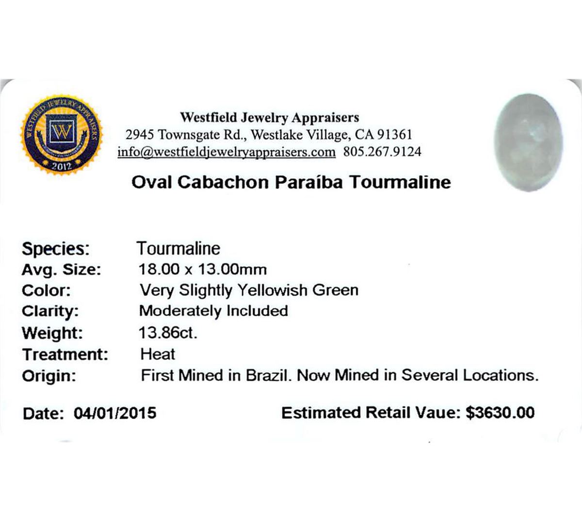 One oval cabochon cut natural Paraiba tourmaline exact weight 13.86ct., clarity is moderately included, cut is good. Westfield Appraised at $3,630.00.