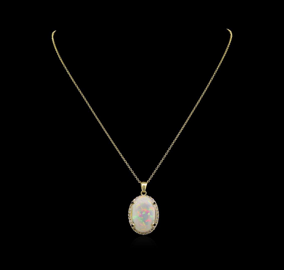 One electronically tested 14KT yellow gold lady's combination cast & assembled fashion pendant & chain 18.0" long, 1.5mm oval cable link with a lobster claw clasp with a bright polish finish. Identified with markings of "14K". Condition is new, good workmanship. Containing: One semi crystal opal that is cut in a oval shaped cabochon and is prong set, measuring 24.87 mm long x 16.55 mm wide, and 6.88 mm thick and the approximate weight is 13.86 carats. The opal has a very bright, red multicolor play of color (fire) in a broad flashfire pattern; a medium dome; a very good cut; no inclusions; consistent in its brightness and pattern; and is not directional. Graded loose prior to setting. Thirty-Two prong set round brilliant cut diamonds, measuring 2.00 - 1.90 x 1.21mm (depth est.) approximate total weight of 32 Stones = 0.90ct. Graded in the setting. Clarity: VS-2 to SI-2. Color: G - I. Cut Good. Total Weight of Diamonds 0.90ct. Total Weight of Opals 13.86ct. Total Weight of Pendant & Chain 9.60gm. GAS Appraised at $11,105.00.
