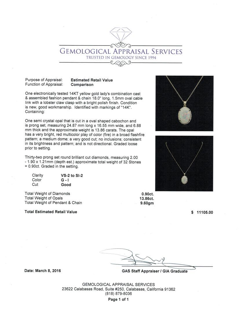 One electronically tested 14KT yellow gold lady's combination cast & assembled fashion pendant & chain 18.0" long, 1.5mm oval cable link with a lobster claw clasp with a bright polish finish. Identified with markings of "14K". Condition is new, good workmanship. Containing: One semi crystal opal that is cut in a oval shaped cabochon and is prong set, measuring 24.87 mm long x 16.55 mm wide, and 6.88 mm thick and the approximate weight is 13.86 carats. The opal has a very bright, red multicolor play of color (fire) in a broad flashfire pattern; a medium dome; a very good cut; no inclusions; consistent in its brightness and pattern; and is not directional. Graded loose prior to setting. Thirty-Two prong set round brilliant cut diamonds, measuring 2.00 - 1.90 x 1.21mm (depth est.) approximate total weight of 32 Stones = 0.90ct. Graded in the setting. Clarity: VS-2 to SI-2. Color: G - I. Cut Good. Total Weight of Diamonds 0.90ct. Total Weight of Opals 13.86ct. Total Weight of Pendant & Chain 9.60gm.