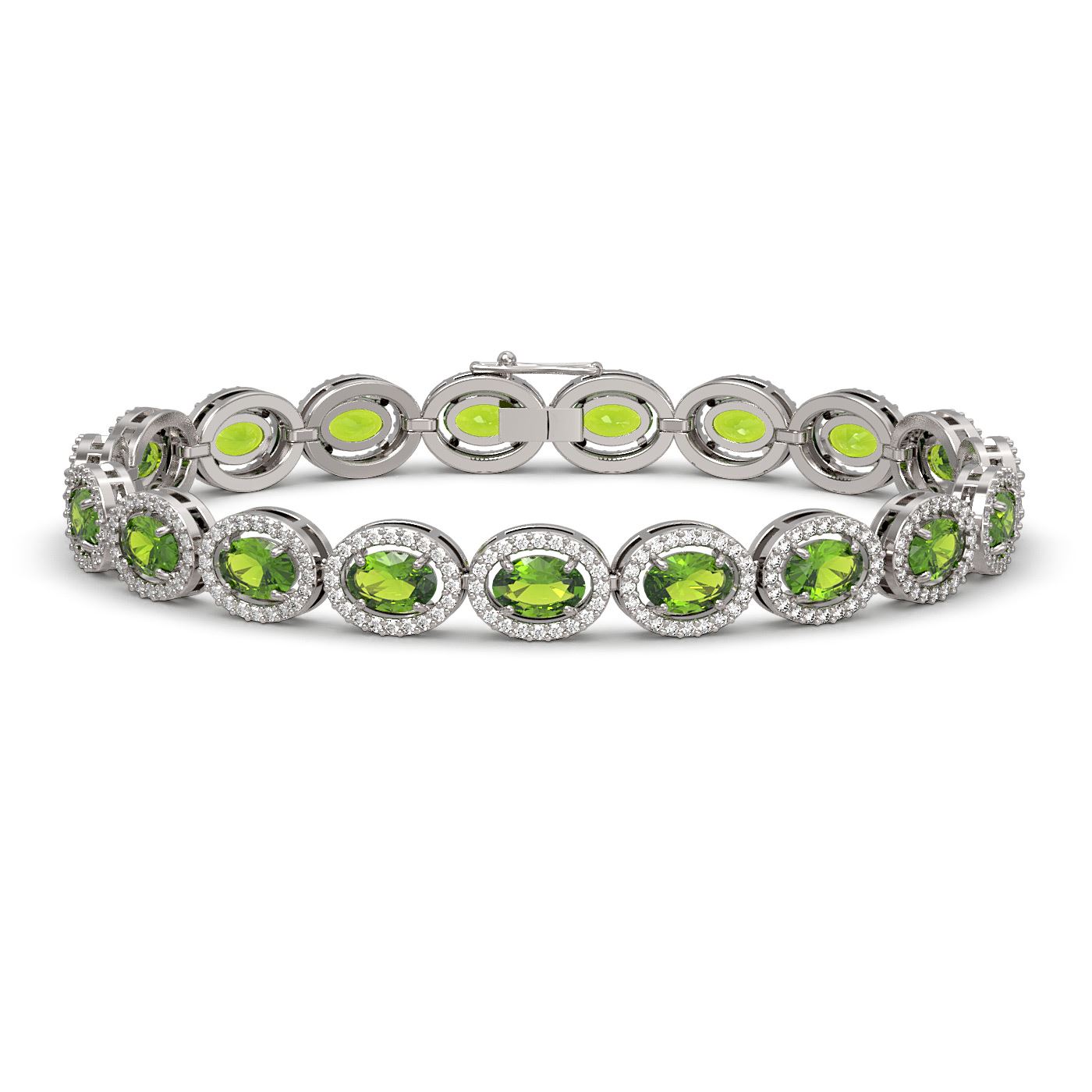 REF-251F6N -40478 ---- 13.87 CTW Peridot & Diamond Halo Bracelet 10K White Gold ---- Luxury Designer Brand Bracelet Appraised at $13,850 Certificate Number US40478 10k White gold, Bracelet Size is 7 Inches, Bracelet measuring approx. 8 mm x 7 Inches, weighing in total approx. 13 grams. Made in the USA and is stamped 10k, Main stone 11.02 carat total weight containing 19 pieces of Intense Green color with AAA quality Oval shape cut Peridot , Stone #2 2.85 carat total weight containing 380 pieces of G-H color with VS/SI quality Round shape cut Diamond