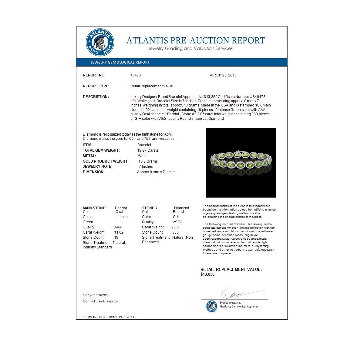 REF-251M6H -40478 ---- 13.87 CTW Peridot & Diamond Halo Bracelet 10K White Gold ---- Luxury Designer Brand Bracelet Appraised at $13,850 Certificate Number US40478 10k White gold, Bracelet Size is 7 Inches, Bracelet measuring approx. 8 mm x 7 Inches, weighing in total approx. 13 grams. Made in the USA and is stamped 10k, Main stone 11.02 carat total weight containing 19 pieces of Intense Green color with AAA quality Oval shape cut Peridot , Stone #2 2.85 carat total weight containing 380 pieces of G-H color with VS/SI quality Round shape cut Diamond