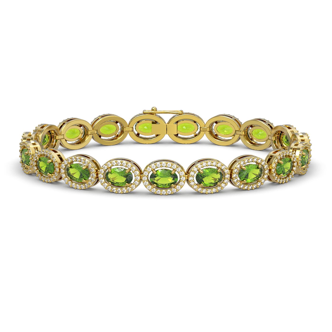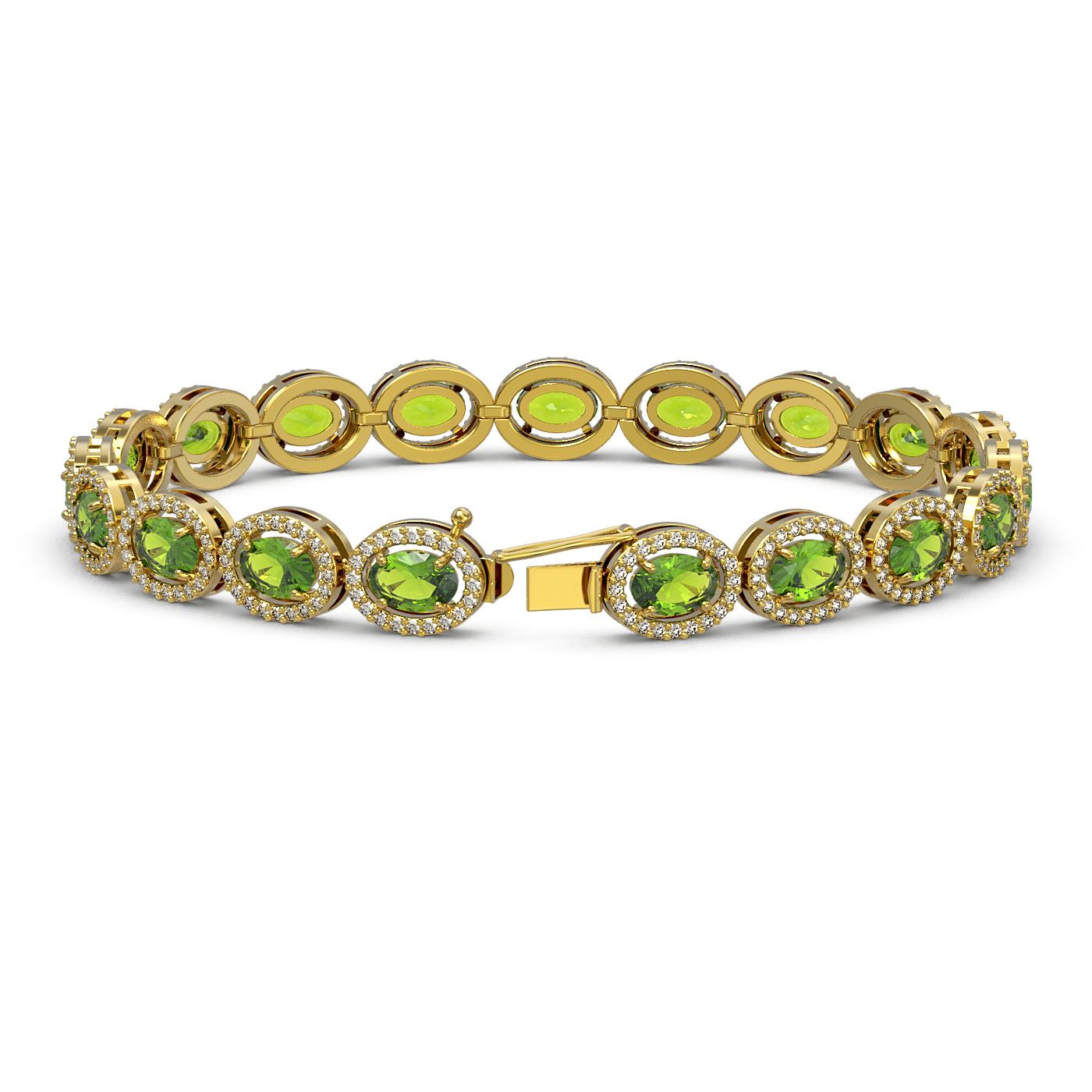REF-251K6W -40480 ---- 13.87 CTW Peridot & Diamond Halo Bracelet 10K Yellow Gold ---- Luxury Designer Brand Bracelet Appraised at $13,850 Certificate Number US40480 10k Yellow gold, Bracelet Size is 7 Inches, Bracelet measuring approx. 8 mm x 7 Inches, weighing in total approx. 13 grams. Made in the USA and is stamped 10k, Main stone 11.02 carat total weight containing 19 pieces of Intense Green color with AAA quality Oval shape cut Peridot , Stone #2 2.85 carat total weight containing 380 pieces of G-H color with VS/SI quality Round shape cut Diamond