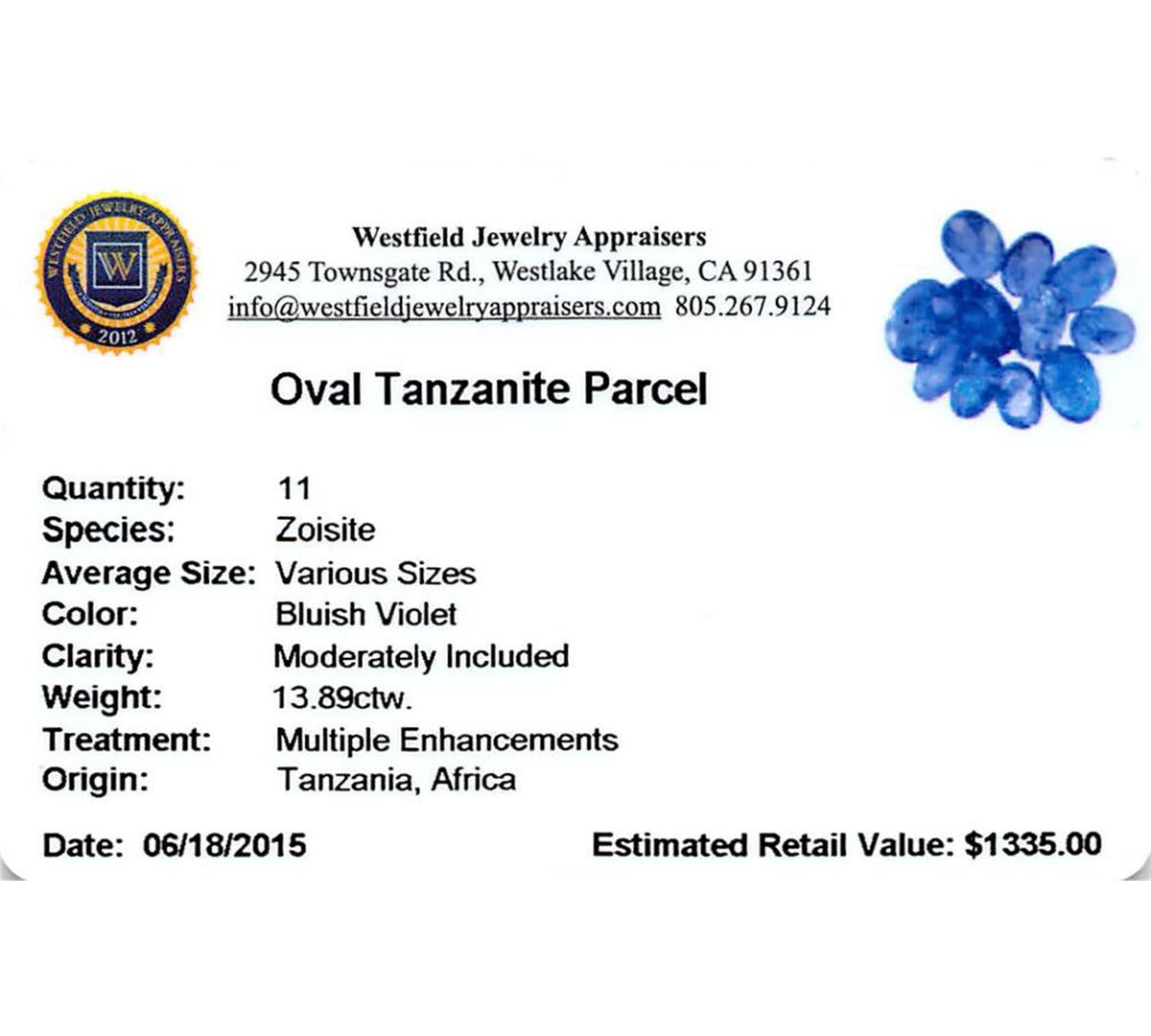 Eleven oval mixed cut natural tanzanites exact total weight 13.89ct., clarity is moderately included, type I, medium dark, very slightly grayish, bluish violet color, (GIA bV 6/3), cut is good. Transmitting light with a minimum of distortion, transparent. Naturally occurring internal & external characteristics are present. Color grade is an average for the group. Tanzanite is a very rare gemstone that is only found in the country of Tanzania. Originally discovered in 1967. Tiffany & Company, named the stone Tanzanite. It is found in the Usumburu Mountains that border the Umba Valley of northern Tanzania. Tanzanite occurs in gray, brown, violet, blue, reddish-purple, & green. The gem is interesting because of its exceptional pleochroism. Rotated in different directions a tanzanite will exhibit multiple changes of color. Tanzanite has a low tolerance to ultrasonic cleaning, and should not be cleaned using this method. Westfield Appraised at $1,335.00.