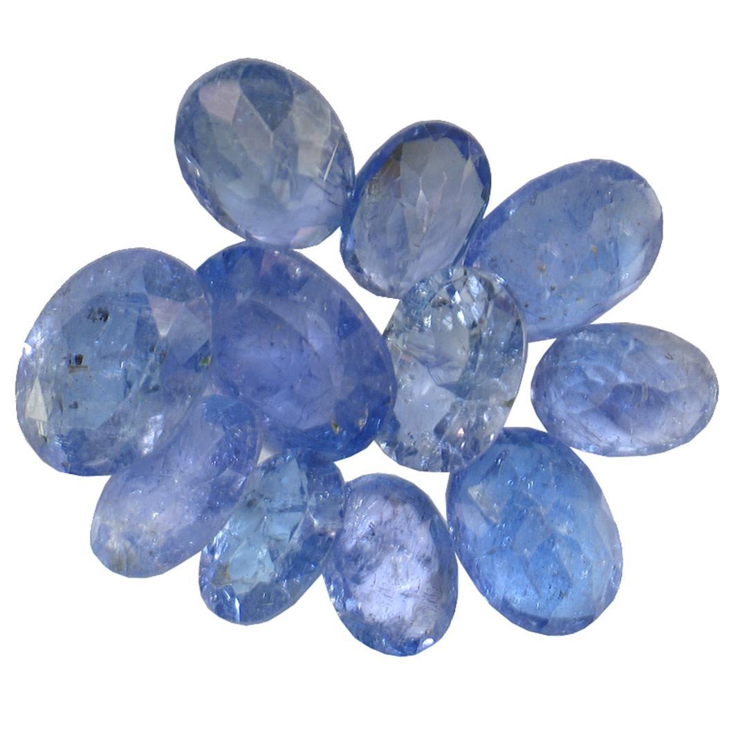 Eleven oval mixed cut natural tanzanites exact total weight 13.89ct., clarity is moderately included, type I, medium dark, very slightly grayish, bluish violet color, (GIA bV 6/3), cut is good. Transmitting light with a minimum of distortion, transparent. Naturally occurring internal & external characteristics are present. Color grade is an average for the group. Tanzanite is a very rare gemstone that is only found in the country of Tanzania. Originally discovered in 1967. Tiffany & Company, named the stone Tanzanite. It is found in the Usumburu Mountains that border the Umba Valley of northern Tanzania. Tanzanite occurs in gray, brown, violet, blue, reddish-purple, & green. The gem is interesting because of its exceptional pleochroism. Rotated in different directions a tanzanite will exhibit multiple changes of color. Tanzanite has a low tolerance to ultrasonic cleaning, and should not be cleaned using this method. Westfield Appraised at $1,335.00.