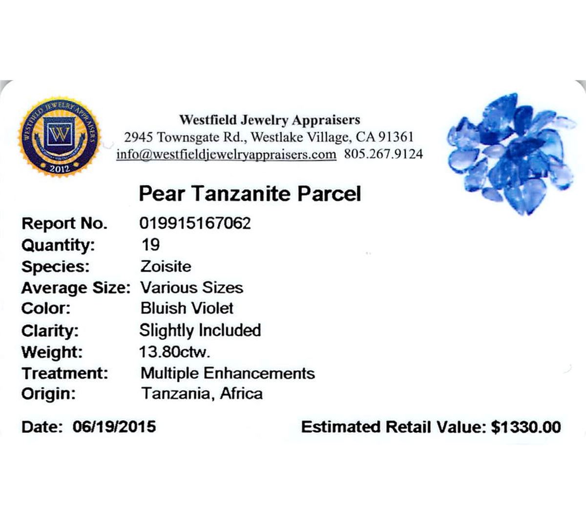 Nineteen pear mixed cut natural tanzanites exact total weight 13.80ct., clarity is slightly included, type I, medium dark, very slightly grayish, bluish violet color, (GIA bV 6/3), cut is good. Transmitting light with a minimum of distortion, transparent. Naturally occurring internal & external characteristics are present. Color grade is an average for the group. Tanzanite is a very rare gemstone that is only found in the country of Tanzania. Originally discovered in 1967. Tiffany & Company, named the stone Tanzanite. It is found in the Usumburu Mountains that border the Umba Valley of northern Tanzania. Tanzanite occurs in gray, brown, violet, blue, reddish-purple, & green. The gem is interesting because of its exceptional pleochroism. Rotated in different directions a tanzanite will exhibit multiple changes of color. Tanzanite has a low tolerance to ultrasonic cleaning, and should not be cleaned using this method. Westfield Appraised at $1,330.00.