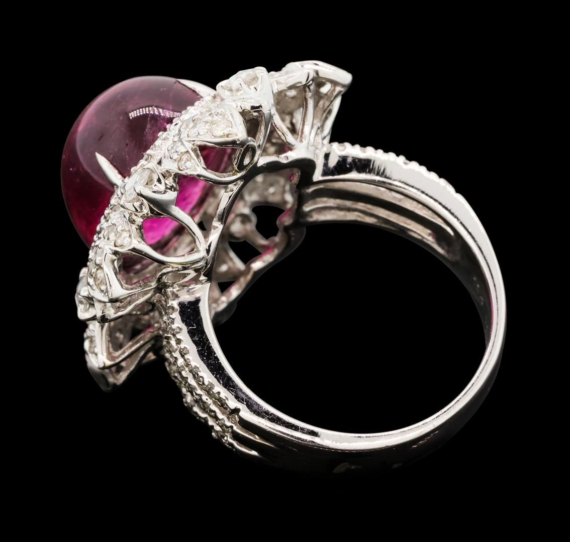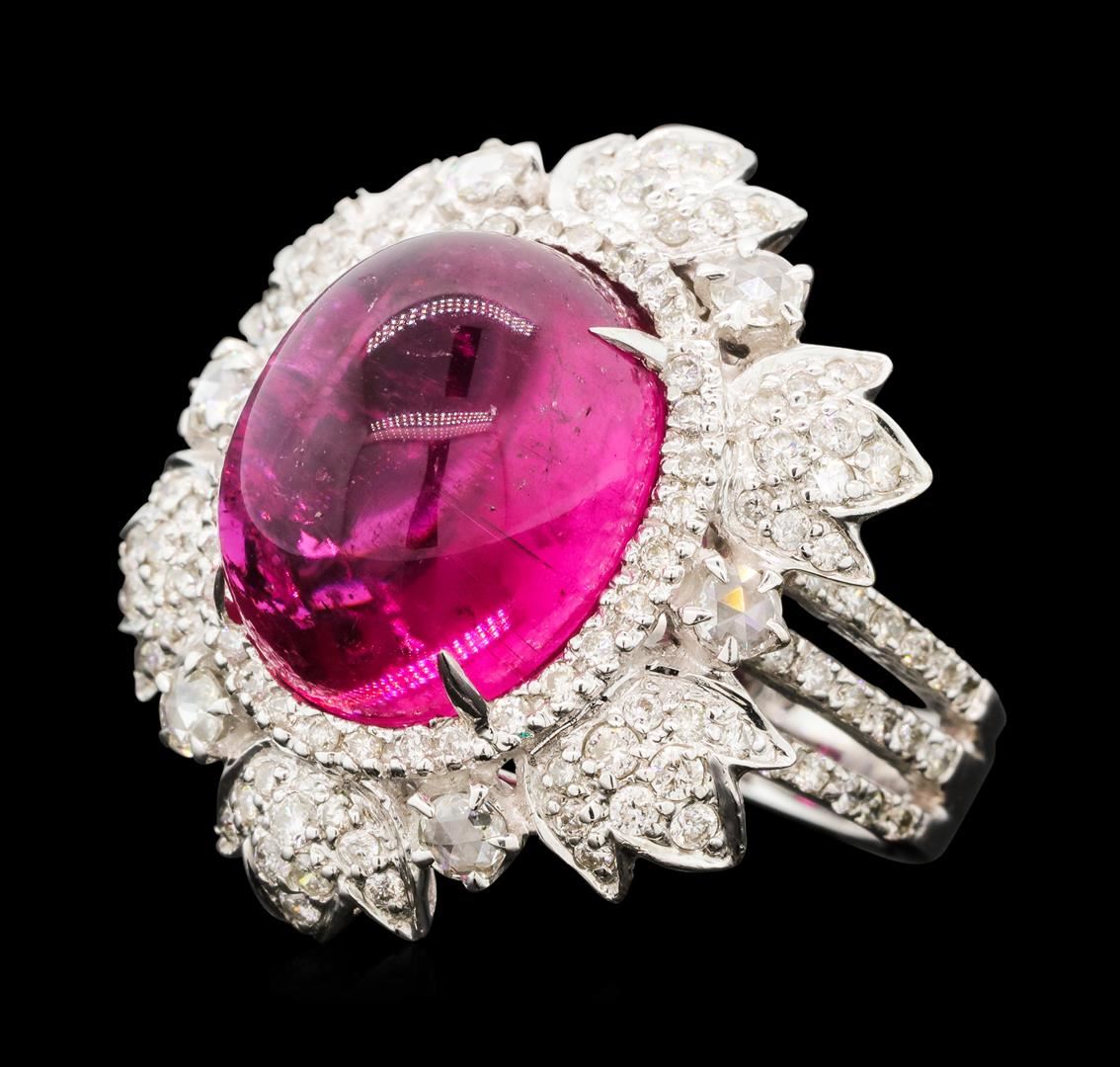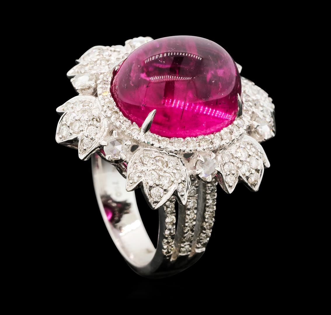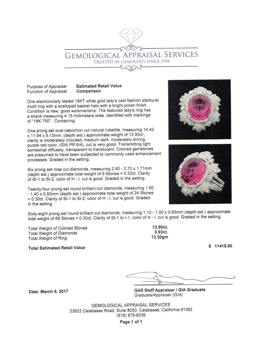 One electronically tested 18KT white gold lady's cast fashion starburst motif ring with a scalloped basket halo with a bright polish finish. The featured lady's ring has a shank measuring 4.15 millimeters wide. Identified with markings of '18K 750'. Condition is new, good workmanship. Containing: One prong set oval cabochon cut natural rubellite, measuring 14.42 x 11.94 x 9.13mm, (depth est.) approximate weight of 13.90ct., clarity is moderately included, medium dark, moderately strong, purple red color, (GIA PR 6/4), cut is very good. Transmitting light somewhat diffusely, transparent to translucent. Colored gemstones are presumed to have been subjected to commonly used enhancement processes. Graded in the setting. Six prong set rose cut diamonds, measuring 2.80 - 2.70 x 1.71mm (depth est.) approximate total weight of 6 Stones = 0.33ct. Graded in the setting. Color H - I Clarity SI-1 to SI-2 Cut Good Twenty-Four prong set round brilliant cut diamonds, measuring 1.60 - 1.40 x 0.93mm (depth est.) approximate total weight of 24 Stones = 0.30ct. Graded in the setting. Color H - I Clarity SI-1 to SI-2 Cut Good Sixty-Eight prong set round brilliant cut diamonds, measuring 1.10 - 1.00 x 0.65mm (depth est.) approximate total weight of 68 Stones = 0.30ct. Graded in the setting. Color H - I Clarity SI-1 to I-1 Cut Good. Total Weight of Colored Stones 13.90ct.. Total Weight of Diamonds 0.93ct.. Total Weight of Ring 12.30gm GAS Appraised at $11,415.00.