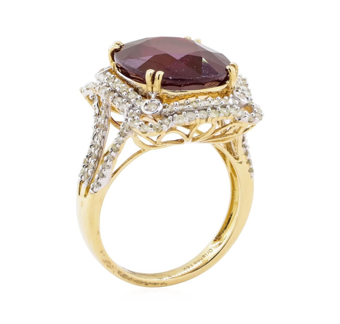 One electronically tested 14KT yellow gold ladies cast ruby and diamond ring. The featured ruby is set within a stylized diamond bezel supported by a lattice under gallery and diamond set three-way split shoulders, completed by a two and one-half millimeter wide band. Bright polish finish with rhodium accents. Trademark is Orianne. Identified with markings of "14K". Condition is new, good workmanship. Containing: One prong set oval mixed cut natural ruby, measuring 15.20 x 13.15 x 8.40mm, approximate weight of 13.90ct., clarity is heavily included, type II, dark, very slightly brownish, slightly purplish red color, (GIA slpR 7/3), cut is good. Transmitting light somewhat diffusely, transparent to translucent. Naturally occurring internal & external characteristics are present. Indications of laboratory high temperature heat treatment, with glass & flux additives. Graded in the setting. Ruby has a low tolerance to rhodium plating, repolishing the surface, & ultrasonic cleaning. One Hundred Twenty-Eight prong set round brilliant cut diamonds approximate total weight of 128 Stones = 0.91ct. The color grade reflects the entire range of color for this group. Graded in the setting. Clarity I-1 to I-3 Color I - L Total Weight of Colored Stones 13.90 ct. Total Weight of Diamonds 0.91 ct. Total Weight of Ring 8.96 gm Estimated Retail Value $ 6,020.00 US