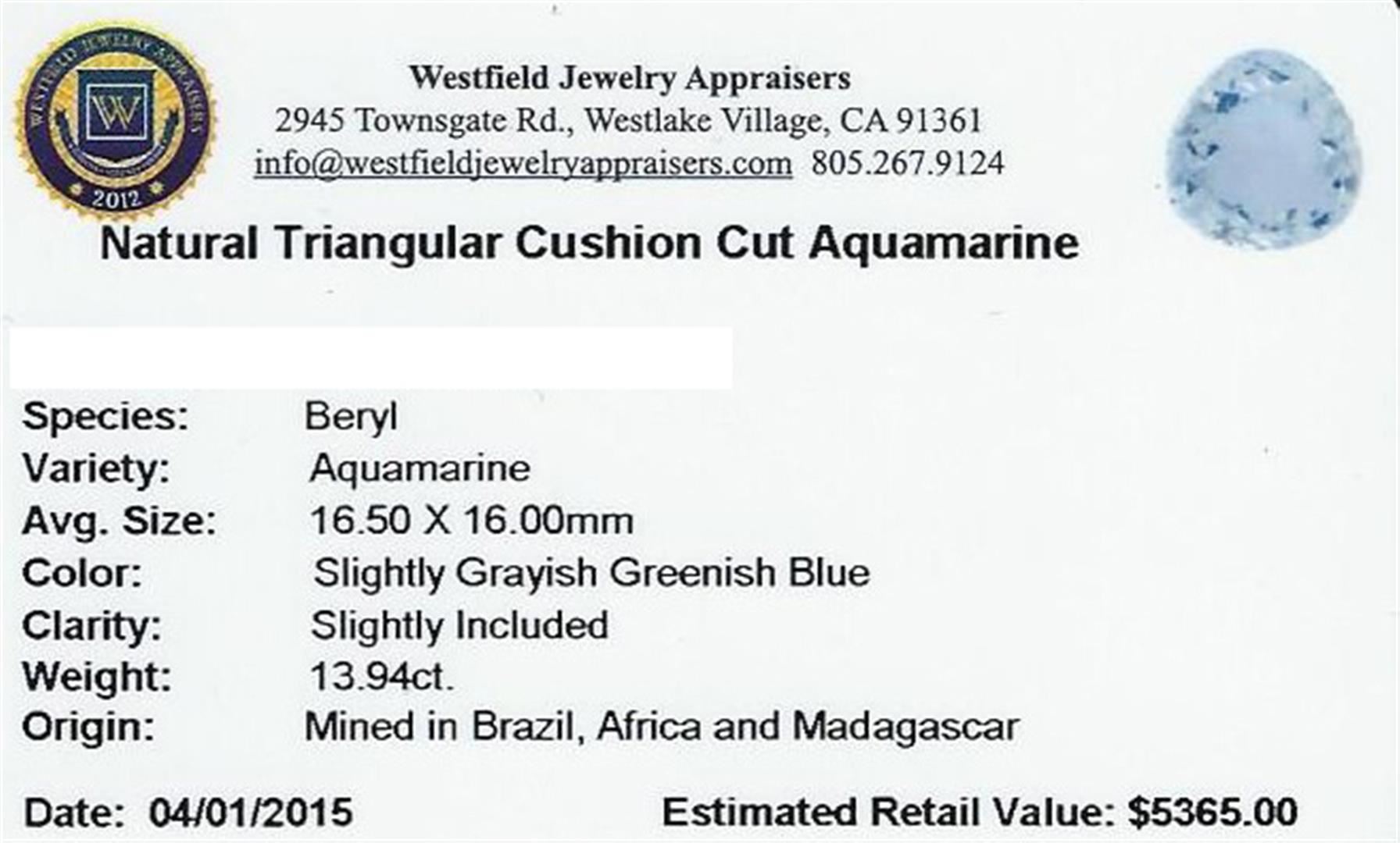 _x000D_One fancy mixed cut natural aquamarine exact weight 13.94ct., clarity is slightly included, type I, medium light, very slightly grayish, very slightly greenish blue color, (GIA vslgB 4/3), cut is good. Westfield Appraised at $5,365.00.