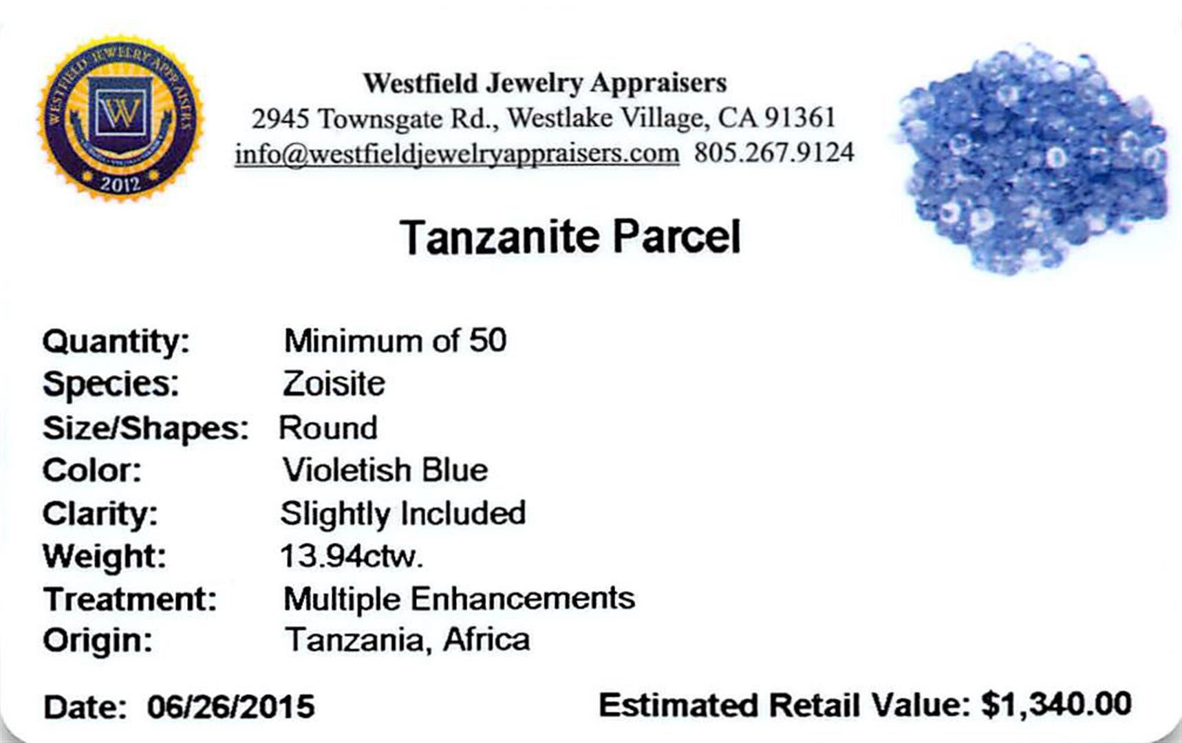 Fifty round mixed cut natural tanzanites, measuring 2.00 - 2.00 x 1.30 mm, exact total weight 13.94ct., clarity is slightly included, type I, medium, very slightly grayish, violetish blue color, (GIA vB 5/3), cut is good. Measurements & the color grade are an average for the group, Color grade is an average for the group, Transmitting light with no distortion, transparent, Naturally occurring internal & external characteristics are present, Indications of multiple laboratory enhancements, including high temperature heat treatment. Westfield Appraised at $1,340.00.