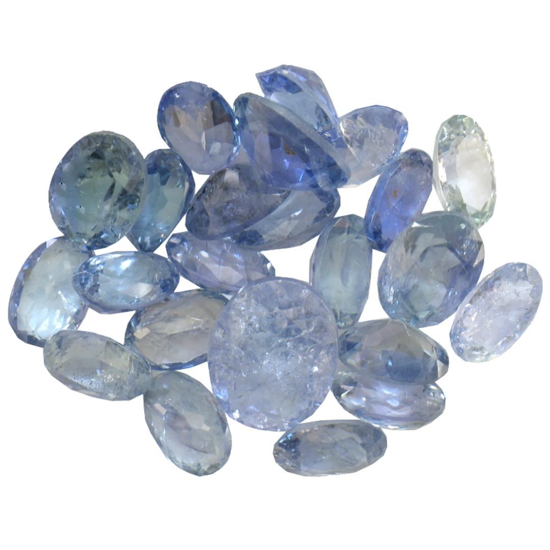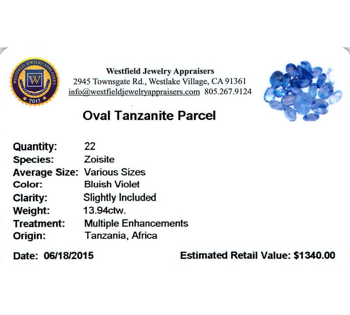 Twenty-two oval mixed cut natural tanzanites exact total weight 13.94ct., clarity is slightly included, type I, medium dark, very slightly grayish, bluish violet color, (GIA bV 6/3), cut is good. Transmitting light with a minimum of distortion, transparent. Naturally occurring internal & external characteristics are present. Color grade is an average for the group. Tanzanite is a very rare gemstone that is only found in the country of Tanzania. Originally discovered in 1967. Tiffany & Company, named the stone Tanzanite. It is found in the Usumburu Mountains that border the Umba Valley of northern Tanzania. Tanzanite occurs in gray, brown, violet, blue, reddish-purple, & green. The gem is interesting because of its exceptional pleochroism. Rotated in different directions a tanzanite will exhibit multiple changes of color. Tanzanite has a low tolerance to ultrasonic cleaning, and should not be cleaned using this method. Westfield Appraised at $1,340.00.