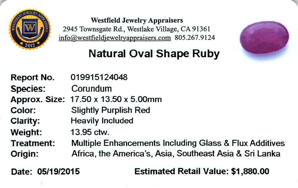 One oval mixed cut natural ruby, measuring 17.50 x 13.50 x 5.00mm, exact weight 13.95ct., clarity is heavily included, type II, medium dark, very slightly brownish, slightly purplish red color, (GIA slpR 6/3), cut is good. Transmitting light somewhat diffusely, transparent to translucent. Naturally occurring internal & external characteristics are present. Indications of laboratory high temperature heat treatment, with glass & flux additives. Ruby has a low tolerance to rhodium plating, repolishing the surface, & ultrasonic cleaning. Westfield Appraised at $1,880.00.