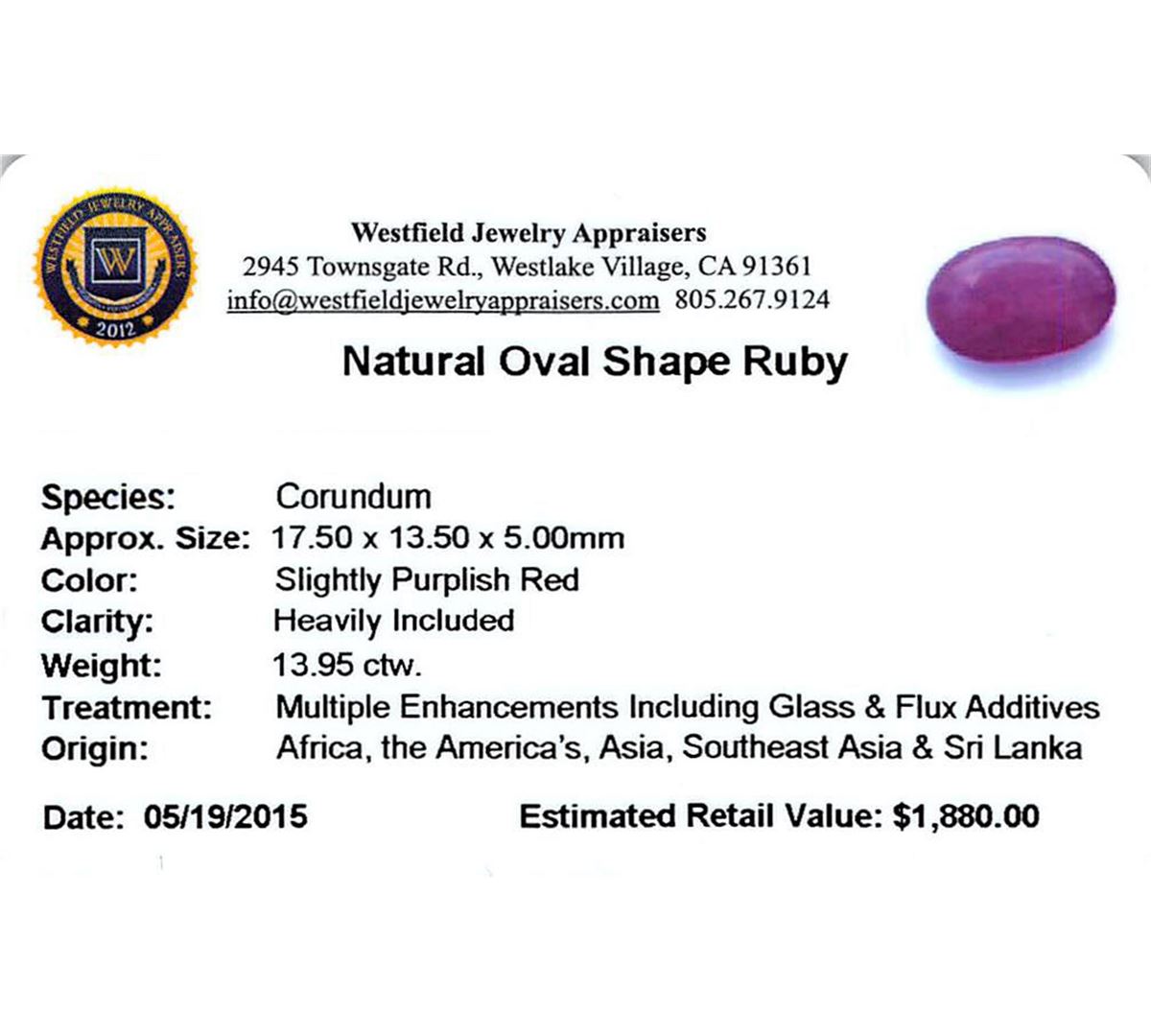 One oval mixed cut natural ruby, measuring 17.50 x 13.50 x 5.00mm, exact weight 13.95ct., clarity is heavily included, type II, medium dark, very slightly brownish, slightly purplish red color, (GIA slpR 6/3), cut is good. Transmitting light somewhat diffusely, transparent to translucent. Naturally occurring internal & external characteristics are present. Indications of laboratory high temperature heat treatment, with glass & flux additives. Ruby has a low tolerance to rhodium plating, repolishing the surface, & ultrasonic cleaning. Westfield Appraised at $1,880.00.