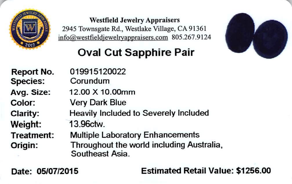 Two oval cut sapphires, measuring 12.00 x 10.00mm, approximate total weight of 13.96ct., clarity is heavily included to severely included, very dark blue color. Indications of multiple laboratory enhancements. Westfield Appraised at $1,256.00.