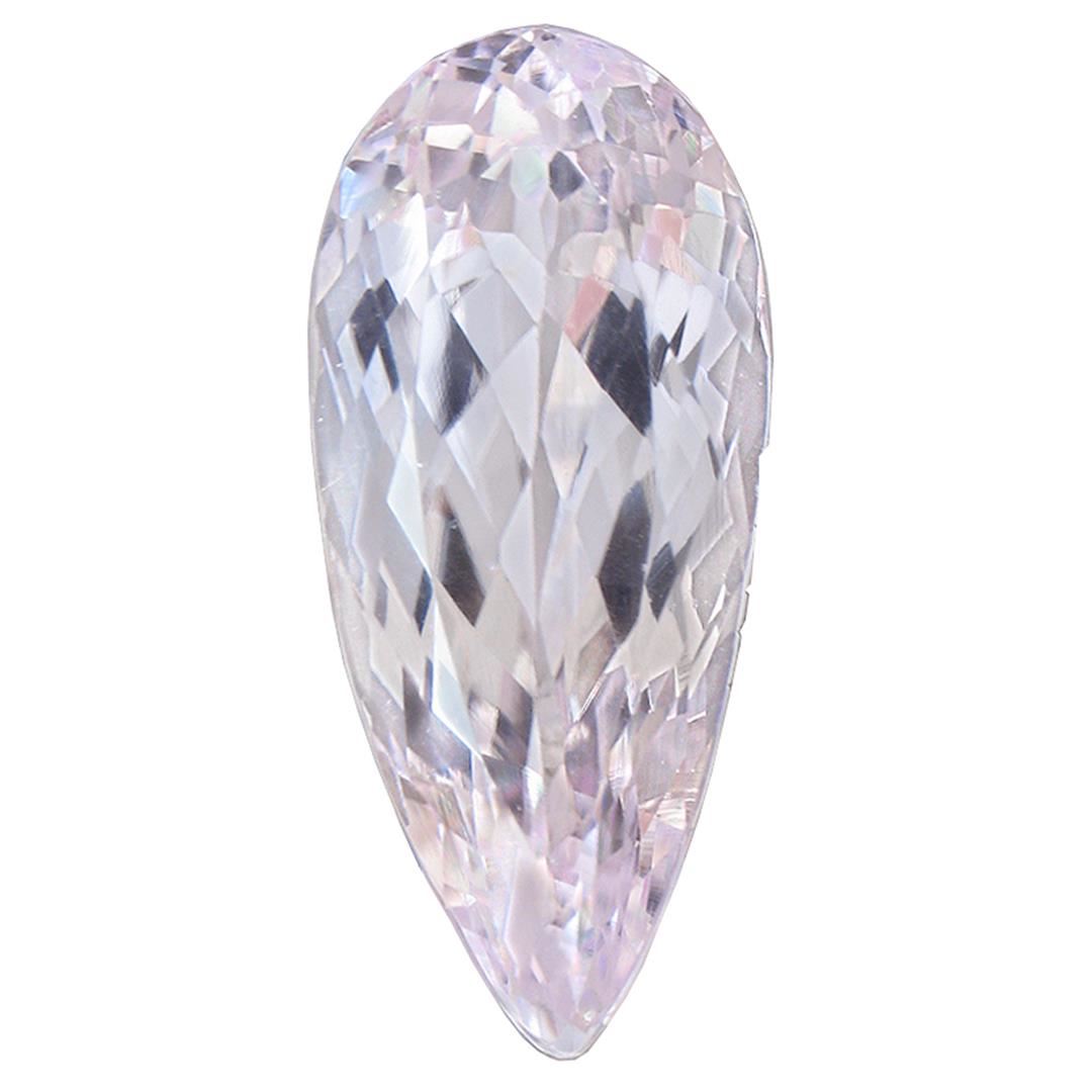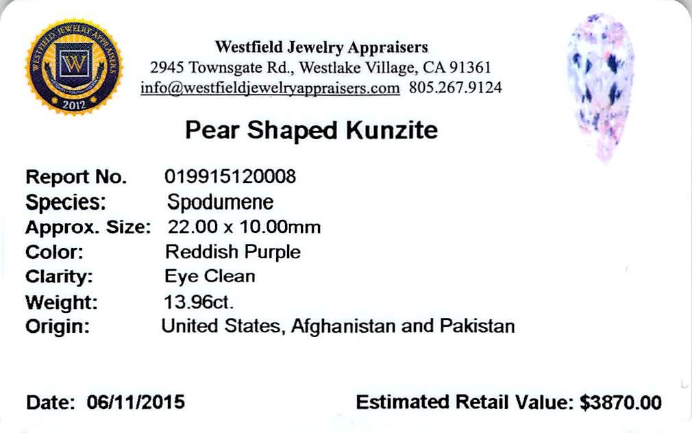 One pear mixed cut natural kunzite, measuring 22.00 x 10.00 x 9.00mm, exact weight 13.96ct., clarity is eye clean, type I, medium light, very slightly grayish, reddish purple color, (GIA rP 4/3), cut is good. Transmitting light with no distortion, transparent. Westfield Appraised at $3,870.00.