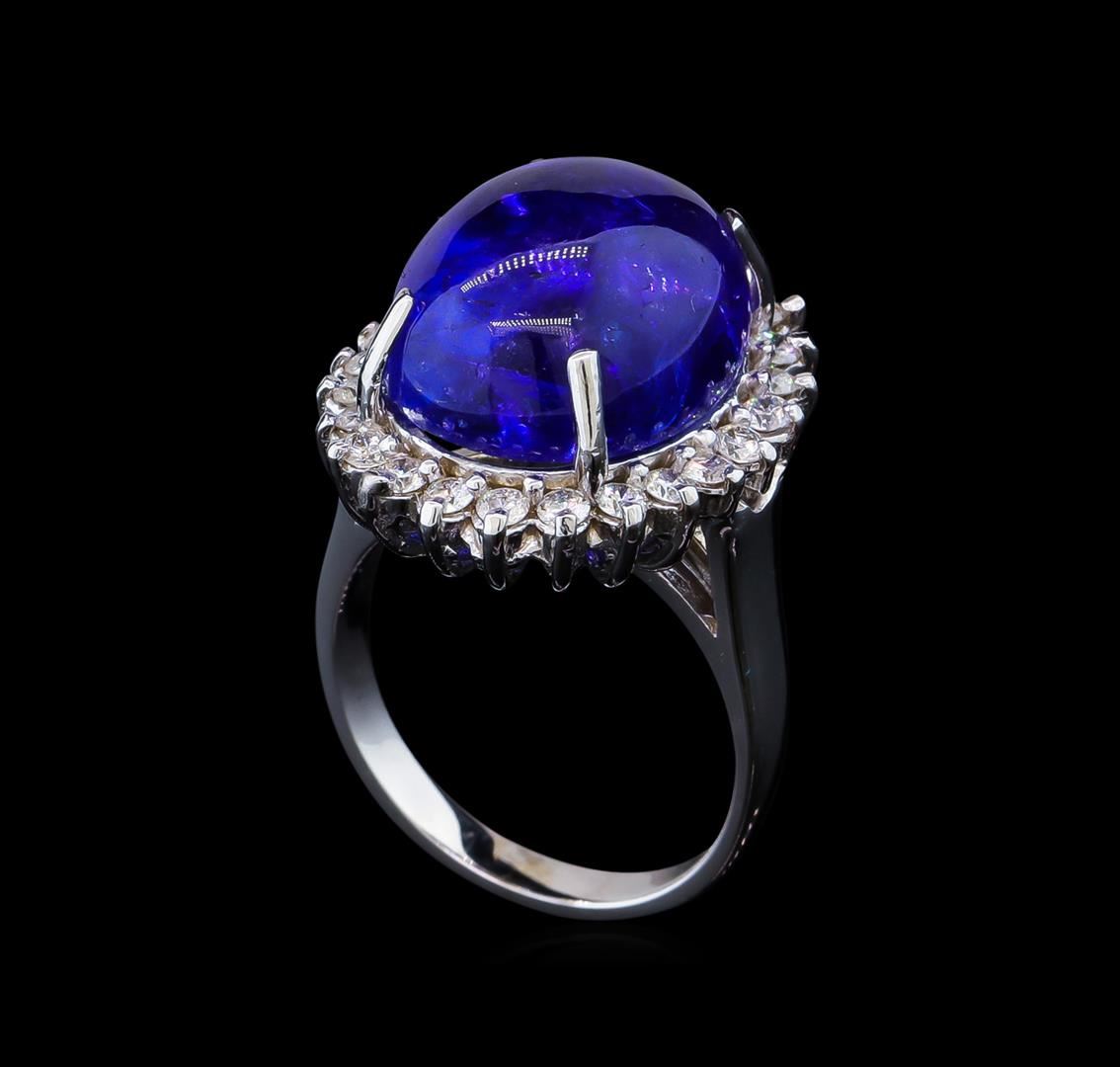 One electronically tested 14KT white gold lady's cast fashion ring with a basket halo with a bright polish finish. The featured lady's ring has a shank measuring 2.63 millimeters in width. Identified with markings of "14K". Condition is new, good workmanship. Containing: One prong set oval cabochon standard cut natural tanzanite, measuring 15.29 x 12.26 x 7.50mm, (depth est.) 10%. bulge factor, approximate weight of 13.98ct., clarity is moderately included, medium dark, moderately strong, violet color, (GIA V 6/4), cut is good. Transmitting light with no distortion, transparent. Colored gemstones are presumed to have been subjected to commonly used enhancement processes. Graded in the setting. Twenty-Four prong set round brilliant cut diamonds, measuring 2.00 - 1.90 x 1.17mm (depth est.) approximate total weight of 24 Stones = 0.64ct. Graded in the setting. Clarity: SI-1 to SI-2. Color: H - I. Cut Good. Total Weight of Colored Stones 13.98ct. Total Weight of Diamonds 0.64ct. Total Weight of Ring 9.40gm. GAS Appraised at $12,925.00.