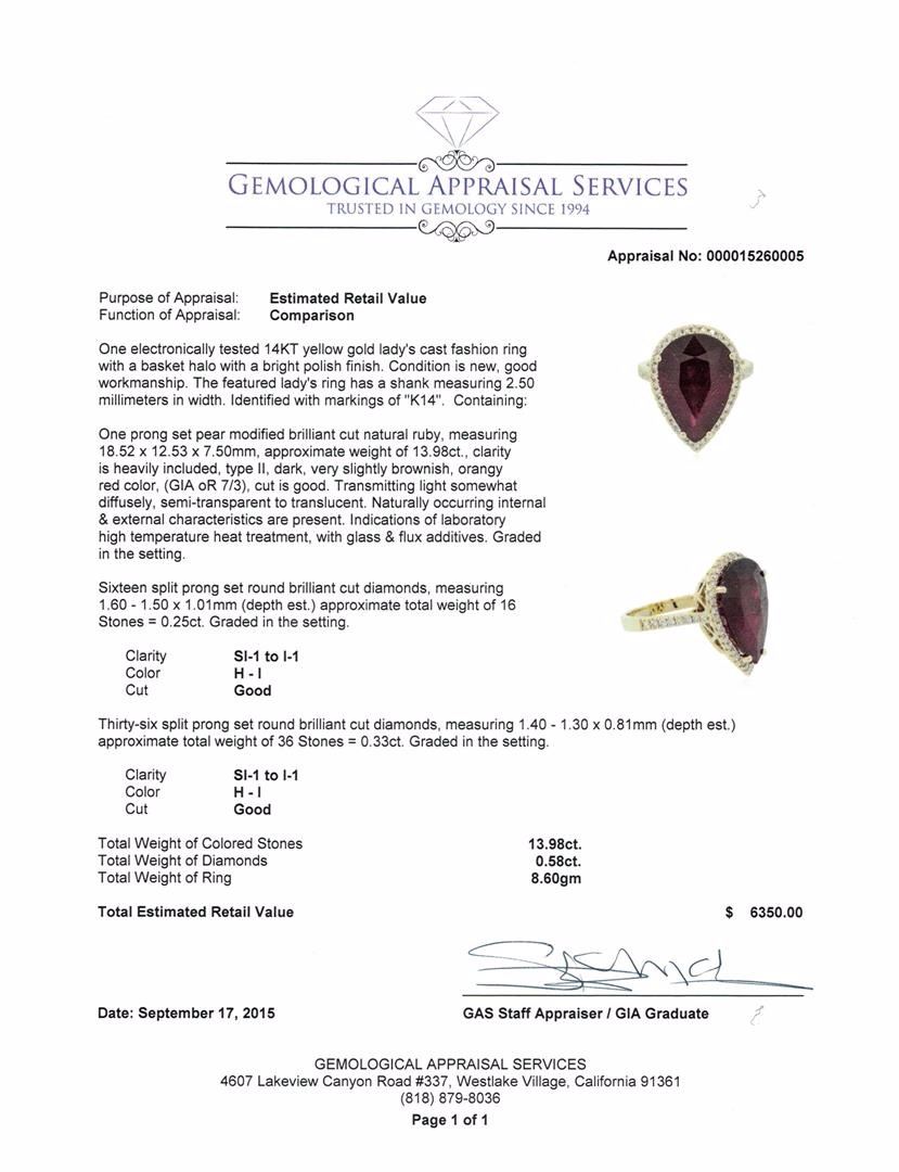 One electronically tested 14KT yellow gold lady's cast fashion ring with a basket halo with a bright polish finish. The featured lady's ring has a shank measuring 2.50 millimeters in width. Identified with markings of "K14". Condition is new, good workmanship. Containing: One prong set pear modified brilliant cut natural ruby, measuring 18.52 x 12.53 x 7.50mm, approximate weight of 13.98ct., clarity is heavily included, type II, dark, very slightly brownish, orangy red color, (GIA oR 7/3), cut is good. Transmitting light somewhat diffusely, semi-transparent to translucent. Naturally occurring internal & external characteristics are present. Indications of laboratory high temperature heat treatment, with glass & flux additives. Graded in the setting. Sixteen split prong set round brilliant cut diamonds, measuring 1.60 - 1.50 x 1.01mm (depth est.) approximate total weight of 16 Stones = 0.25ct. Graded in the setting. Clarity: SI-1 to I-1. Color: H - I. Cut Good Thirty-Six split prong set round brilliant cut diamonds, measuring 1.40 - 1.30 x 0.81mm (depth est.) approximate total weight of 36 Stones = 0.33ct. Graded in the setting. Clarity: SI-1 to I-1. Color: H - I. Cut Good. Total Weight of Colored Stones 13.98ct. Total Weight of Diamonds 0.58ct. Total Weight of Ring 8.60gm. GAS Appraised at $6,350.00.