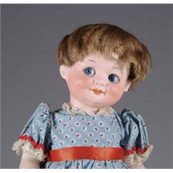 13” AM 323 GOOGLY. An unusually large size for an AM Googly. This charmer is on a five-piece toddler-style body. She has her original tosca mohair wig and antique undergarments but a more recent cotton print dress. Her blue eyes are glancing to the side (reset). CONDITION: Doll has slight cheek scuff. Composition body has wear but overall condition is good. On rim ONLY, there are two 1/4” mold splits present (not hairlines). JL 1-2476