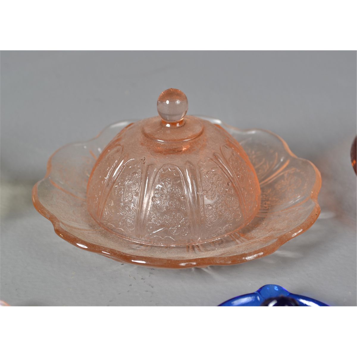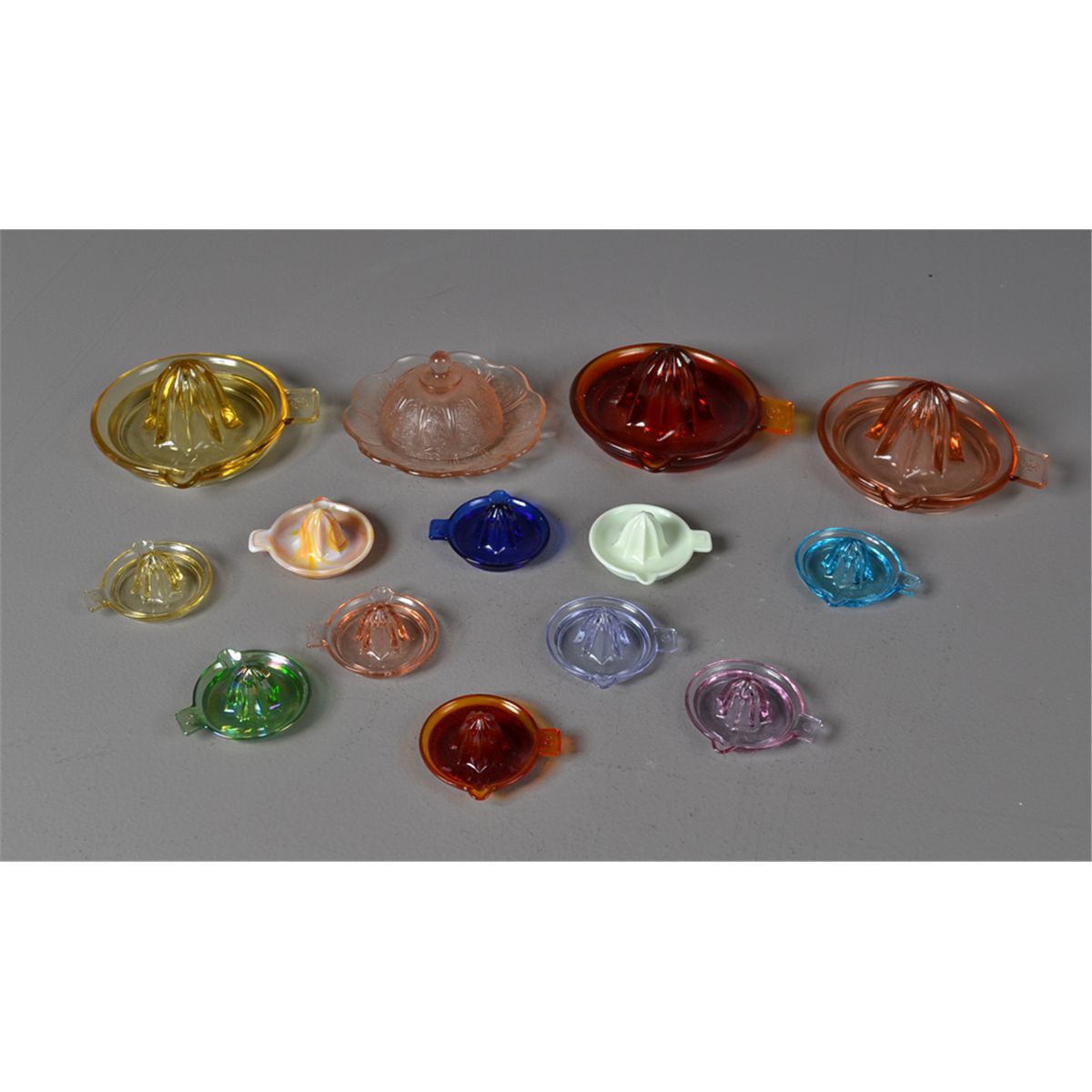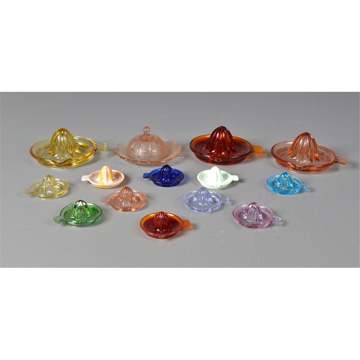 To include twelve glass juicers including irridescent glass, cobalt glass, Vaseline glass, custard glass and various other colors. Many in miniature or possibly children's juicers. Together with a child's pink Depression covered dish. Largest 5". Circa late 19th/early 20th century. Private collection Gregory, MI.