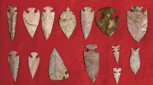 Frame of 13 Arrowheads, Spear points and one Tang knife. All fine condition. (est $400-600)