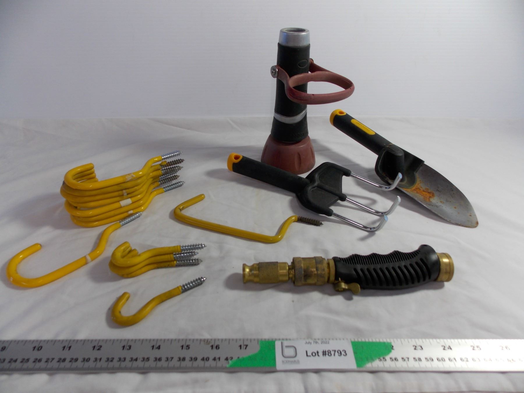 (13) Assorted Hooks, (2) Hoseheads, and Gardening tools