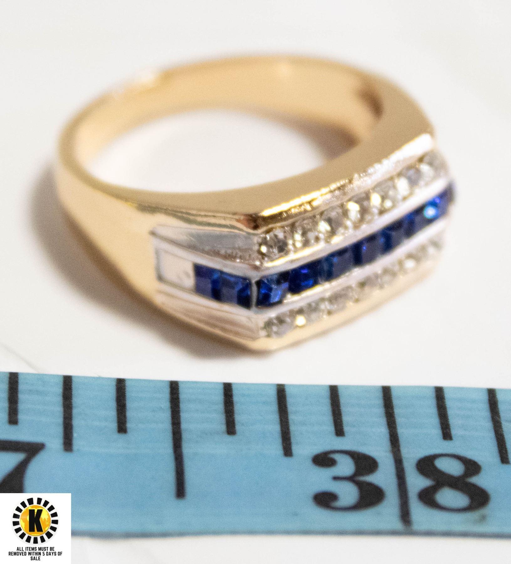 SET IN THE CENTER WITH CHANNEL SET CLEAR CUBIC ZIRCONIA ON EITHER SIDE IN GOLD TONE RING SIZE 10