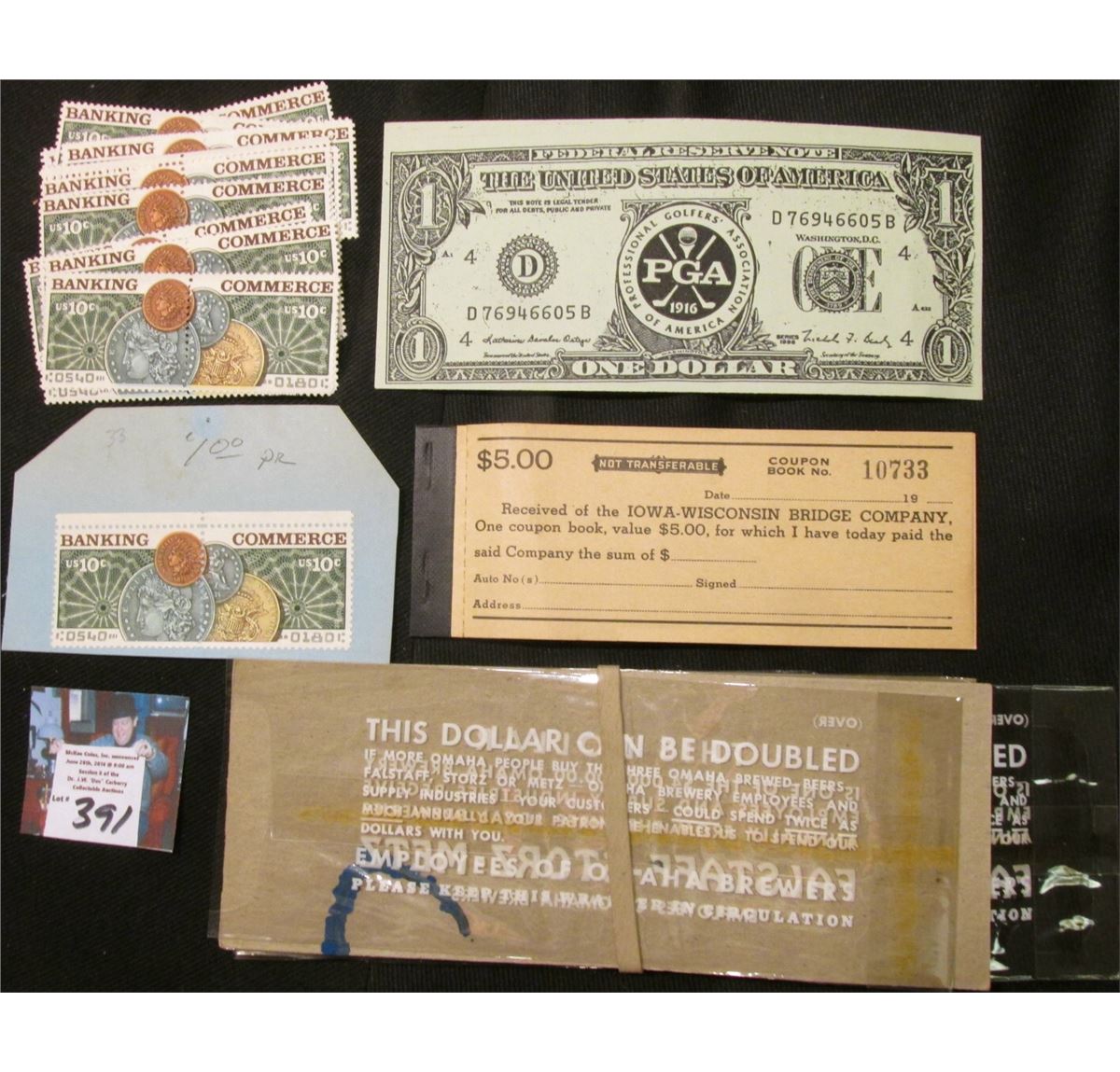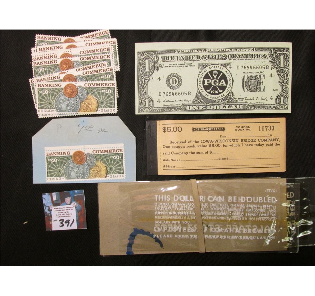 (13) "Banking Commerce" Pairs of Mint U.S. Postage Stamps, ($2.60 face value); unused ticket book with coupons for "Iowa-Wisconsin Bridge Company" allowing crossing of the Blackhawk Bridge on the Mississippi at Lansing, Iowa; bundle of Fallstaff labels for $1 bills to be used in Omaha, Neb.; & a Series 1986 PGA Golf Scrip.