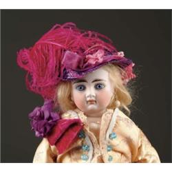 13” CLOSE MOUTH GERMAN BISQUE FASHION CHILD. Swivel neck on separate shoulder plate, head incised “3” on gusseted all-leather body with bisque forearms. Has lovely pale blue threaded eyes, finely feathered eyebrows, dressed in a peach brocade costume trimmed in lace and blue glass buttons, topped off by a purple straw hat and fuschia feathers. CONDITION: This lovely German child fashion has very fine bisque and little to no damage to arms; body is clean and sturdy. RS 1-3571 (800-1,200)