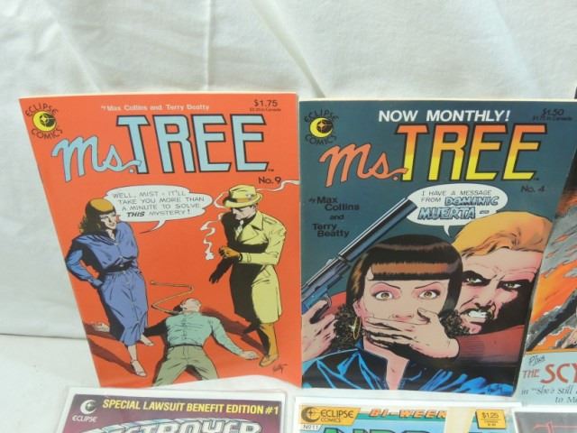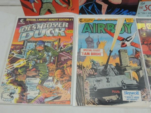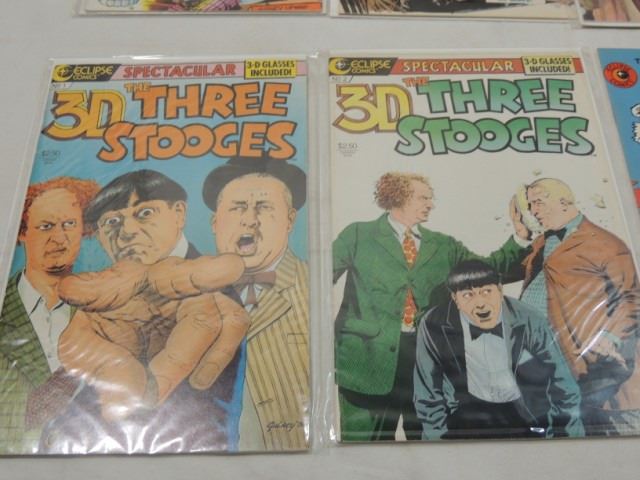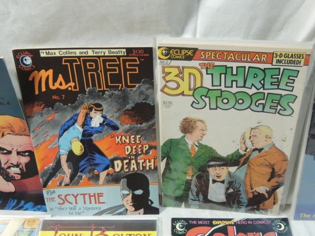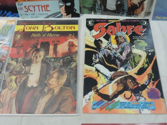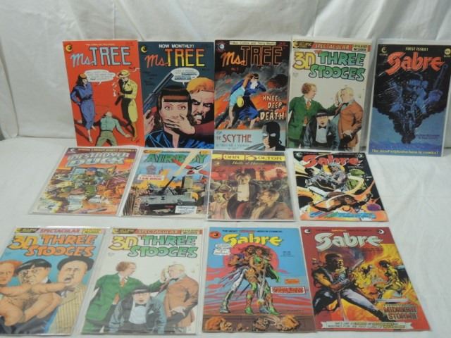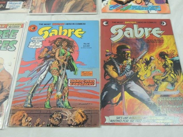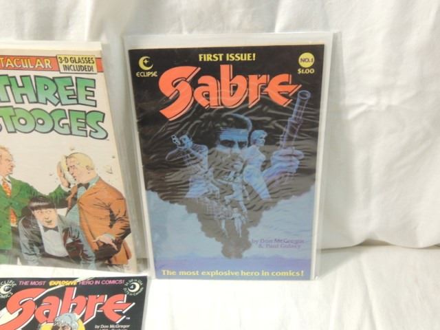 INCLUDING THE 2D THREE STOOGES FIRST ISSUE SABRE AND MORE SABRE COMICS JOHN BOLTON HALLS OF HORROR SPECIAL LAWSUIT BENEFIT EDITION #1 DESTROYER DUCK AIRBOY MC. TREE ALL EXCELLENT AS SHOWN.