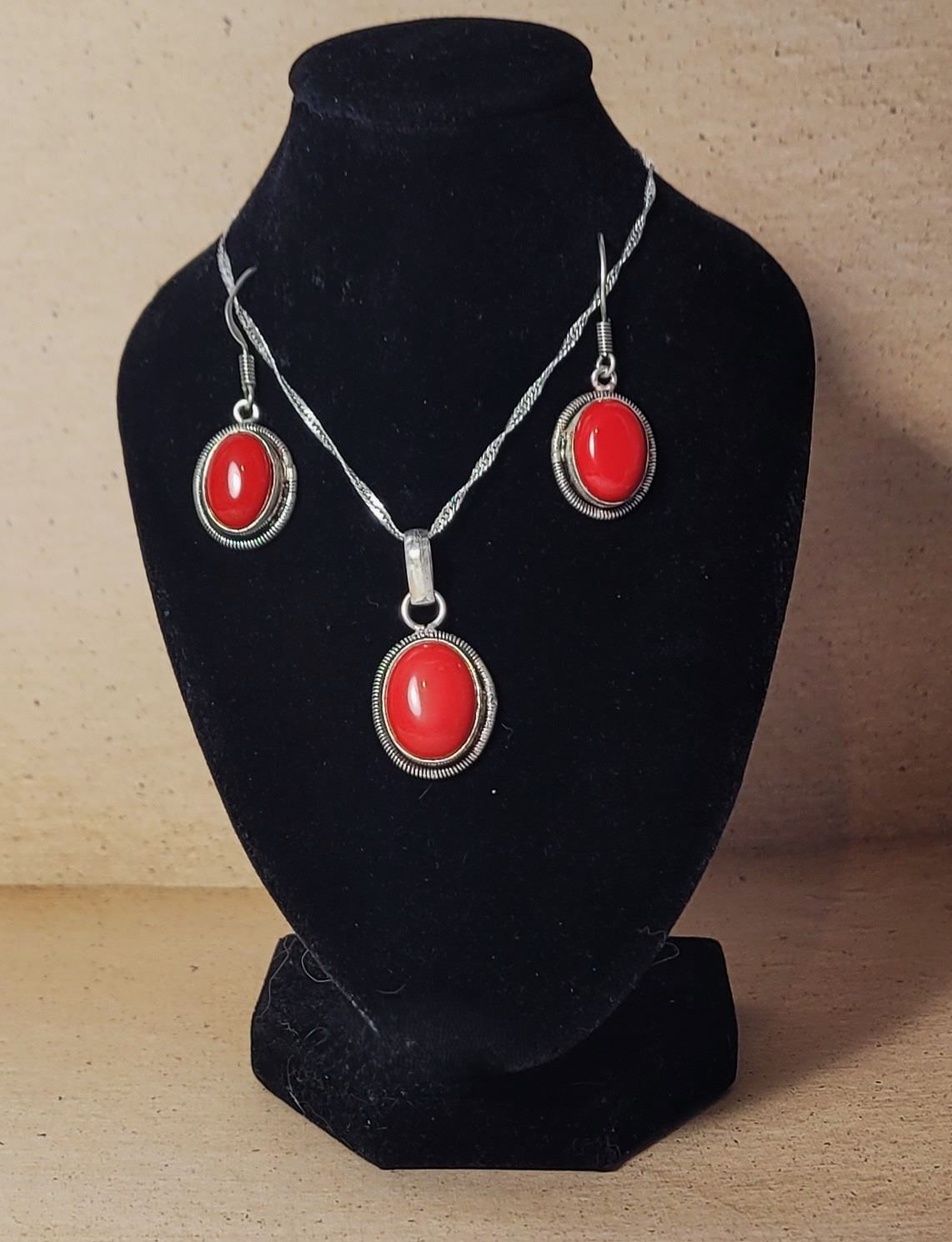 JEWELERY CONSISTING OF OVAL PENDANT ON 18" WAVE CHAIN & MATCHING DROP EARRINGS. JEWELERY