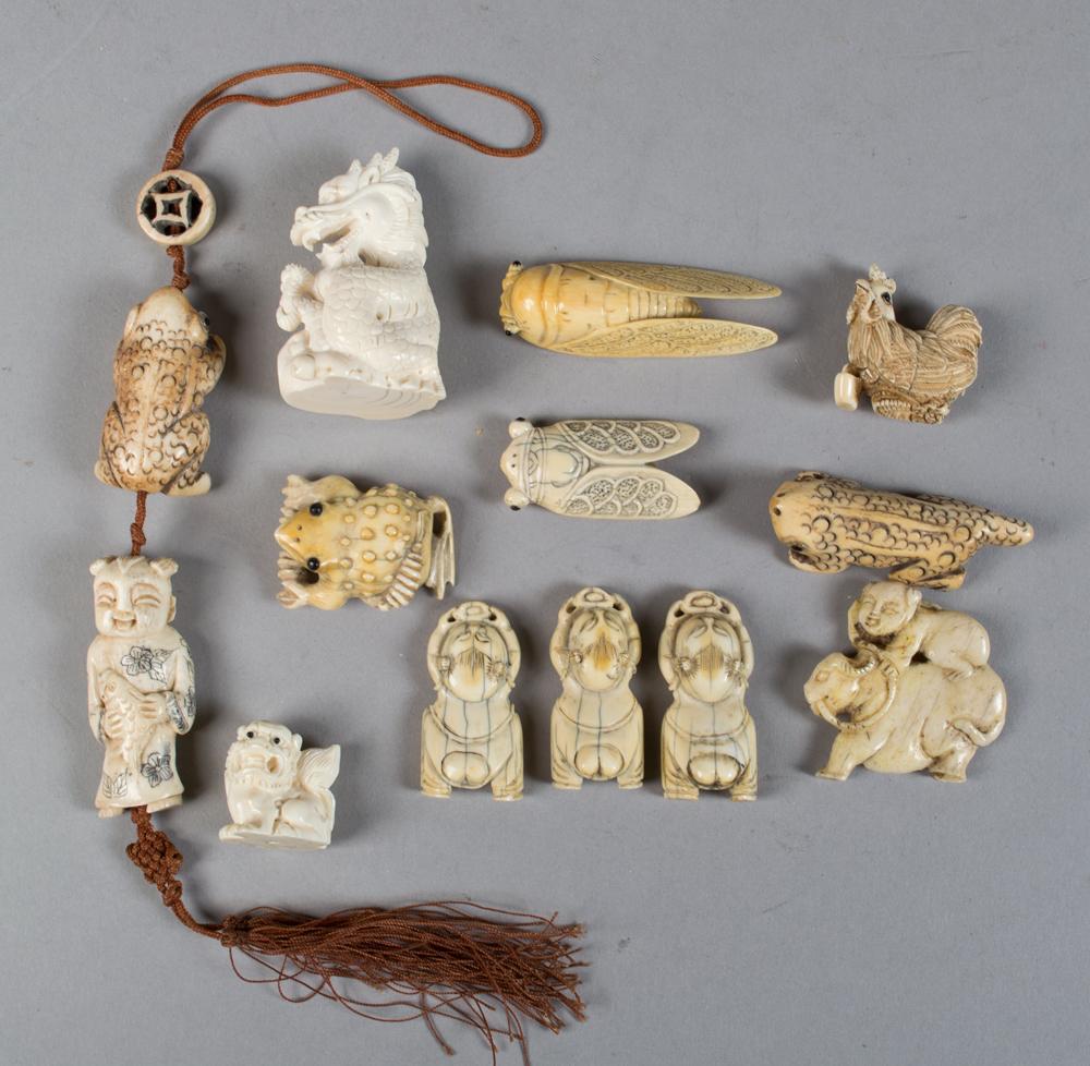 All finely carved to include roosters, figures, frogs, dragons, and cicada bugs, largest is 2.375"L, circa early 20th century.