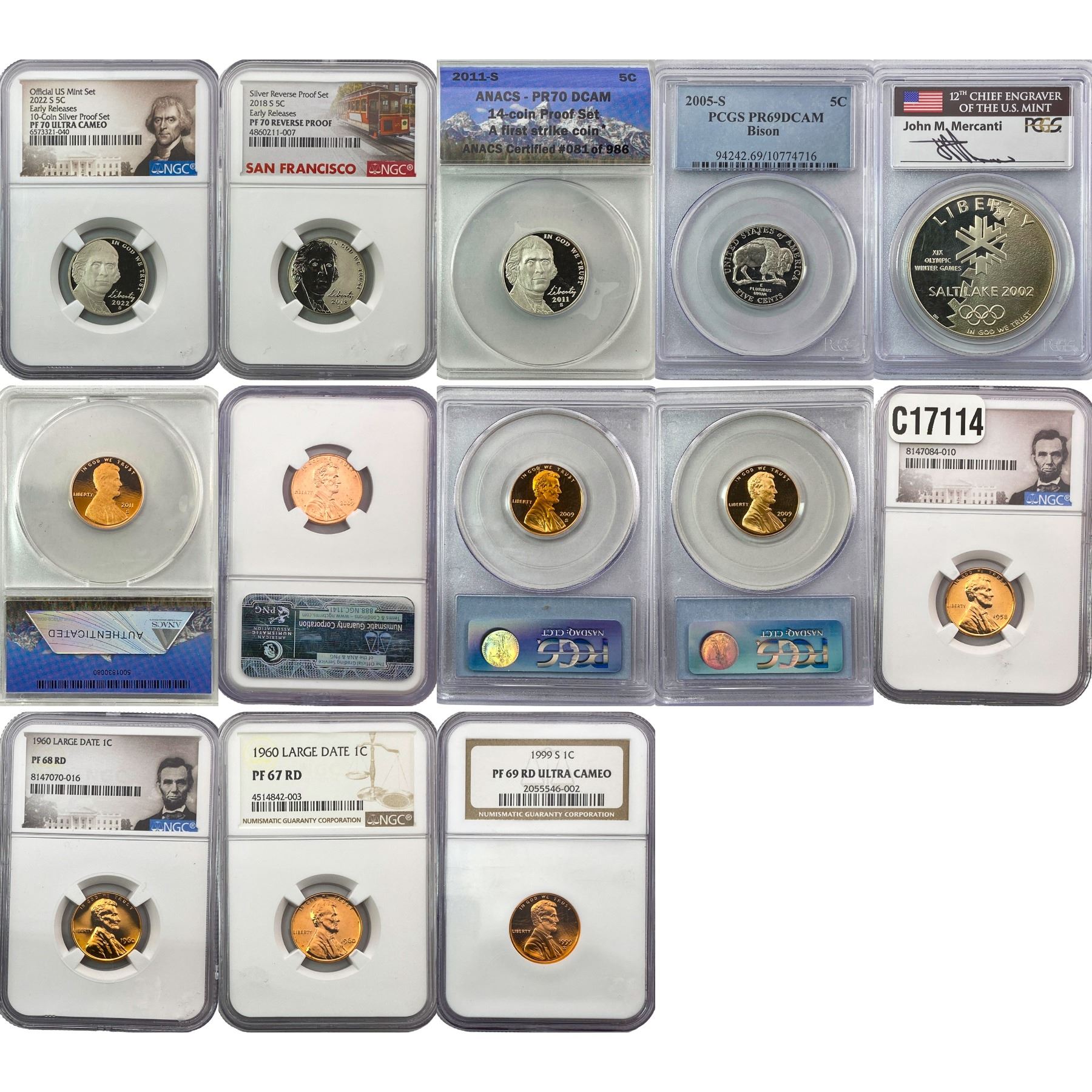 [13 Coins] 1958-2022 Various U.S. Coins ANACS/PCGS/NGC PF/MS67-70