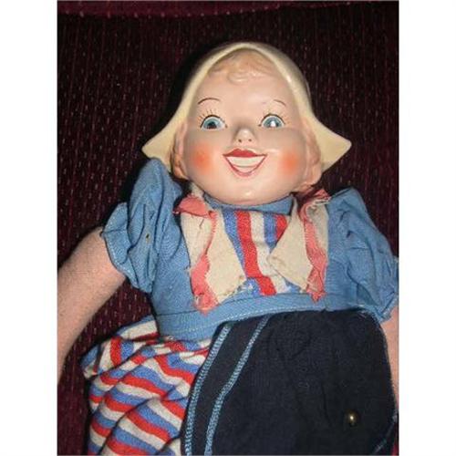 </font></strong>13" Dutch molded head Doll. She is all original with her shoes. The head is a bisque china type material with a glaze for the hat. Her torso is straw stuffed. There is a rattle in the head and I believe it was made that wayu. She is nice and clean. There is one small hole in one of the sleeves and a place in the back needs a few stitches at the waist as the skirt has come undone at the seam. The seam in one arm is open just a little and needs a few stitches also. The limbs appear to be stuffed with cotton fibers of some kind. I have seen another doll almost similiar to this one and the label on it said Liberated Holland Unica Patent Courtray- Belgium. Hope this info helps. This doll does not have a tag. Doll comes from a smoke free environment. Buyer to pay $20 for shipping, handling, and insurance. Thanks for viewing.</font>