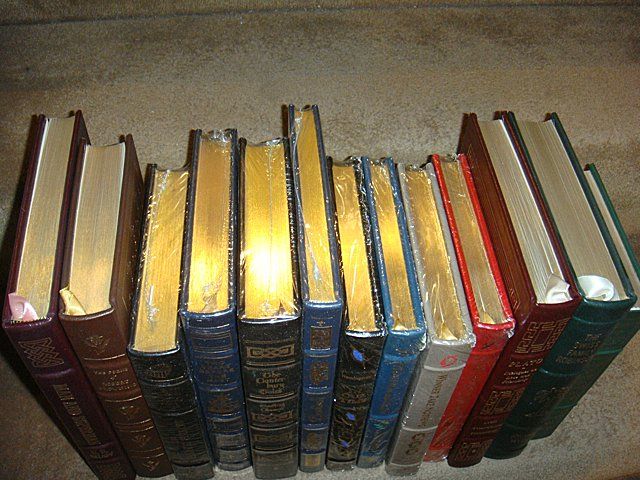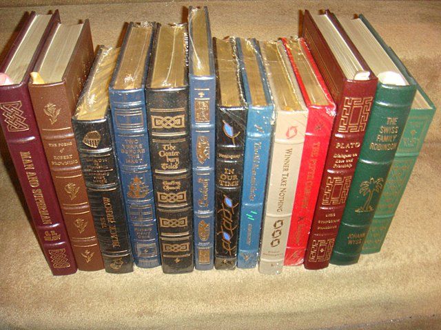 13 Estate Books. Beautifully bound with gold lettering on spines, some still in plastic shrink wrap. This set of classic literature includes: Plato. The Poems of Robert Browning. Man and Superman, G.B. Shaw. Swiss Family Robinson, Johann Wyss. The Mill on the Floss, George Eliot. Winnter Take Nothing, The Fifth Column, In our Time, The Old Man and The Sea by Ernest Hemingway. Beowulf. The Canterbury Tales, Geoffrey Chaucer, Two Years Before the Mast, Richard Henry Dana. The Black Arrow, Robert Louis Stevenson, Illust: N.C. Wyeth