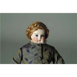 Lot 72: 13" FRENCH CHINA LADY. She has beautiful cobalt blue painted eyes and a serene expression. She is on a French kid body, has a braided mohair wig, and is dressed in an older two-piece blue and gray iridescent silk costume and antique underwear. CONDITION: Body appears to be in sturdy condition with some soiling. 1-966 CL 42