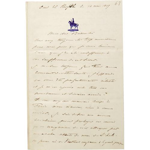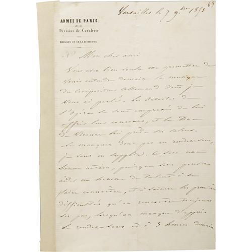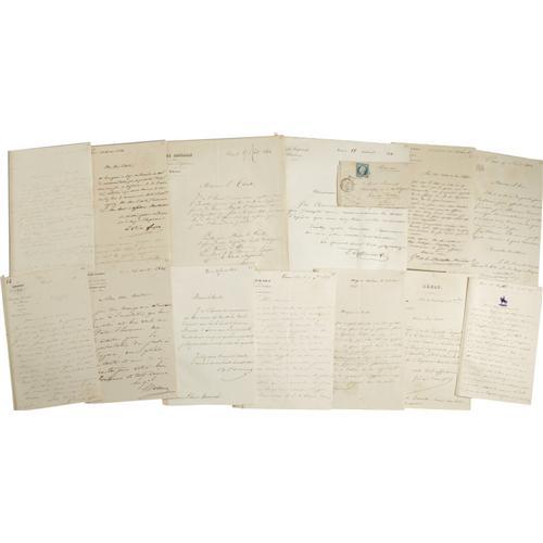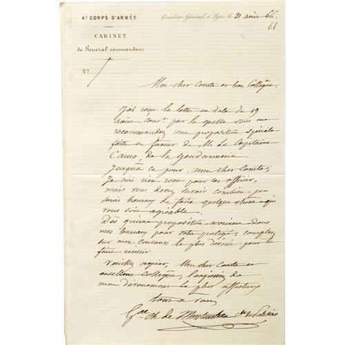 <B>Group of 13 Imperial French Military Letters.</B></I> From an old collection as follows:<BR><B>Gustave Montebello,</B></I> ALS, two pages, 5" x 8", on letterhead, 1858;<BR><B>Charles Montauban,</B></I> ALS, one page, 5" x 8", on letterhead, 1866;<BR><B>Mollard,</B></I> ALS, one page, 5"x 8", on letterhead, 1864;<BR><B>Bourbaki,</B></I> ALS, two pages, with stamped envelope, 1848;<BR><B>Hautpoul,</B></I> ALS, one page, 5.25" x 8", on letterhead, 1864;<BR><B>Emile Felix Fleury,</B></I> ALS, one page, 5" x 8", on letterhead, n.d.;<BR><B>Mellinet,</B></I> ALS, one page, 5" x 8", on letterhead, 1864;<BR><B>Ornano,</B></I> ALS, one page, 5" x 8", 1855;<BR><B>Charles Frossard,</B></I> ALS, one page, 5" x 8", on letterhead, 1864;<BR><B>Goyon,</B></I> ALS, one page, 5" x 8", 1864;<BR><B>Vinoy,</B></I> ALS, one page, 8.25" x 10.5", on letterhead, 1864;<BR><B>Coffiniers,</B></I> ALS, one page, 8" x 10", on letterhead, 1864;<BR><B>Gallifet,</B></I> ALS, three pages, 4.5" x 7", 1869.<BR>Lightly toned with archival tape on left edge for mounting, overall very fine condition.<BR><BR><b>Shipping:</b> Flat Material, Small (<a target="_blank" href="http://www.heritageauctions.com/common/shipping.php">view shipping information</a>)