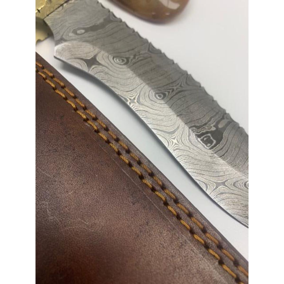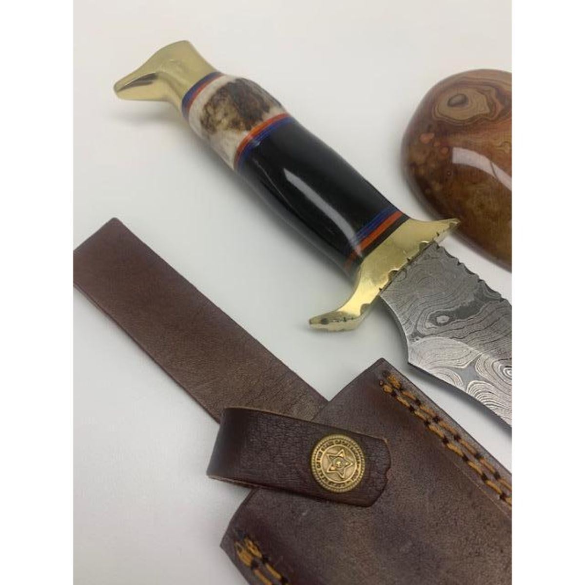 13" Inlaid Wood Handle Damascus Hunting Knife With Stitched Leather Sheath An Excellent Hand Crafted Shive To Add To Any Collection. A Very Well Designed Custom Handle Involving Many Hours Of Craftsmanship & Design Work. High Quality steel is utilized to forge the finest product in the world. Unique Custom Hand-Forged Damascus Steel Hunting Knife Construction: Solid Brass Butt To The Knife Offers A Complete & Sturdy Feel To This Well Crafted Knife. Blade Construction: This superbly designed Marquetry Worked Wooden Handle Damascus Hunting Knife is Custom Designed & Hand Made. The Blade is crafted by hand forging 216 Layers of 1095 and 15N20 high carbon tool steels, with Nickle layer. Blade has been given excellent heat treatment to get a 56 to 57 HRC. Blade has a razor sharp edge. Sheath Construction: High Quality Thick Genuine Stitched Leather Total Length: 13" Length View Photos For Further Details